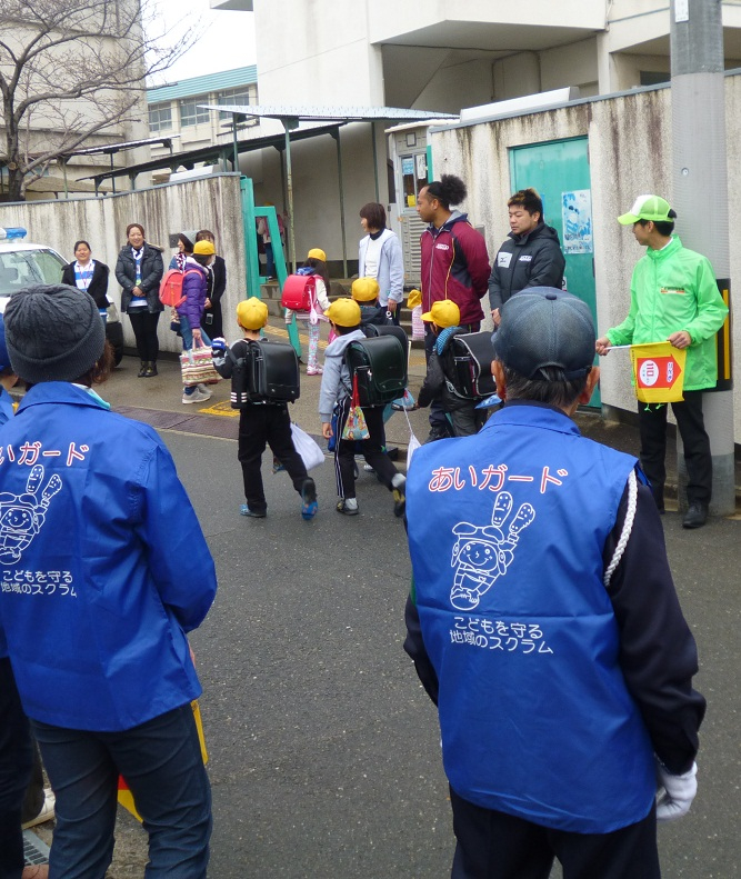 2月23日(月)、健全な子供の育成を目的として、地元・東大阪市の英田自治連合会が推進する「愛ガード運動」にタウファ選手・永下選手が参加しました。