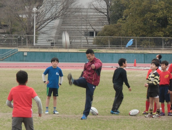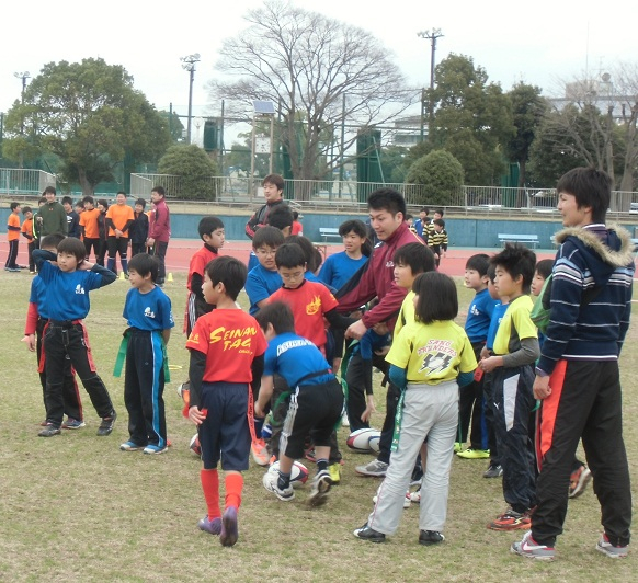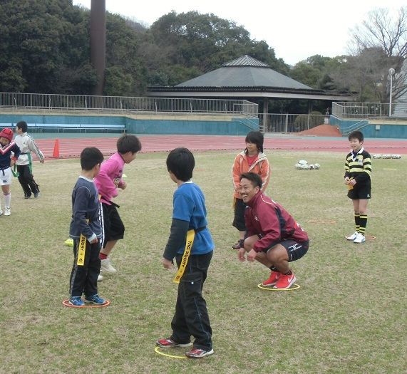 地元・天理高校出身の永下選手を始め、高選手、森選手、王選手、三原選手の5名が講師となり、奈良県内のジュニアラグビーやタグラグビーチーム、また初めてラグビーボールを触った子ども達の約150名がタグラグビーのプログラム中心に体験しました。