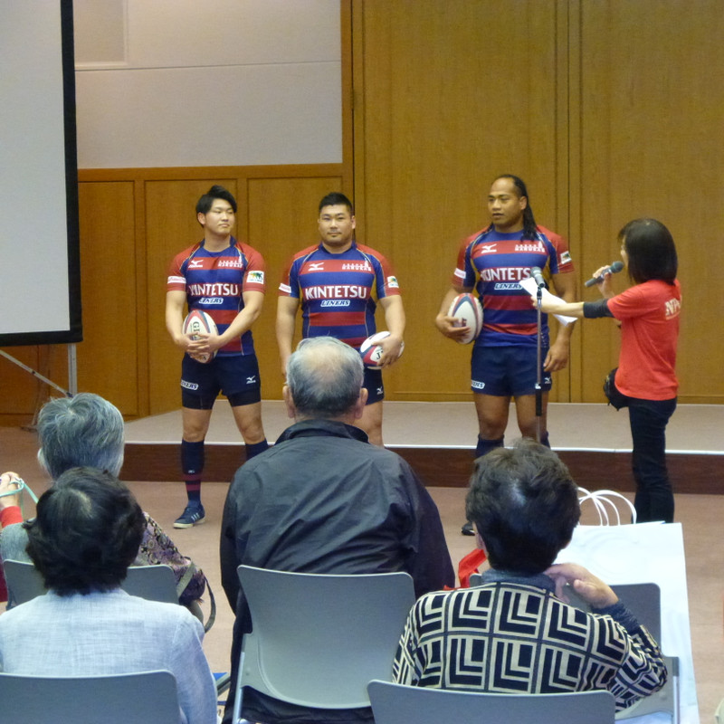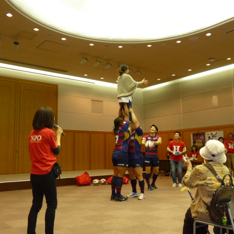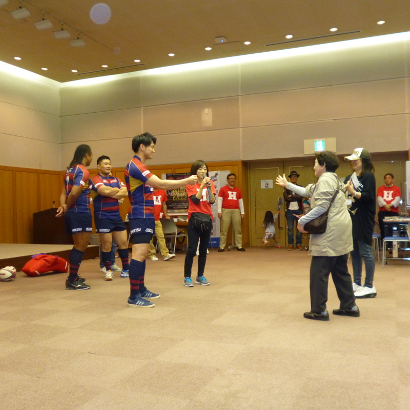 ラグビーワールドカップやトップリーグについてのトークショー、また実際にラグビーボールを