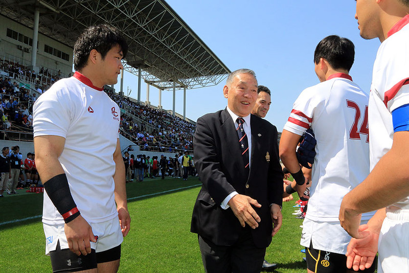 試合前に、関西ラグビーフットボール協会坂田会長(近鉄OB)と東大阪市野田市長から選手一人一人を激励いただきました