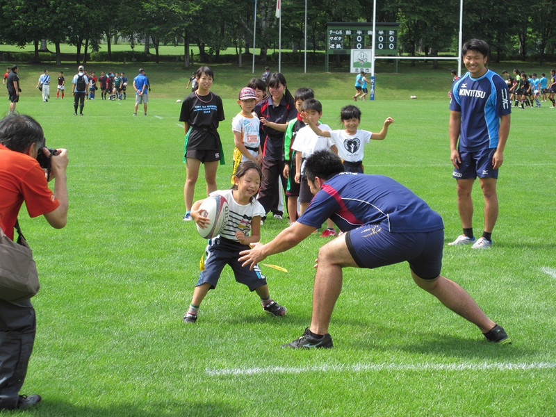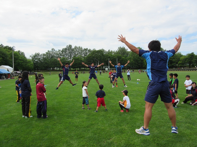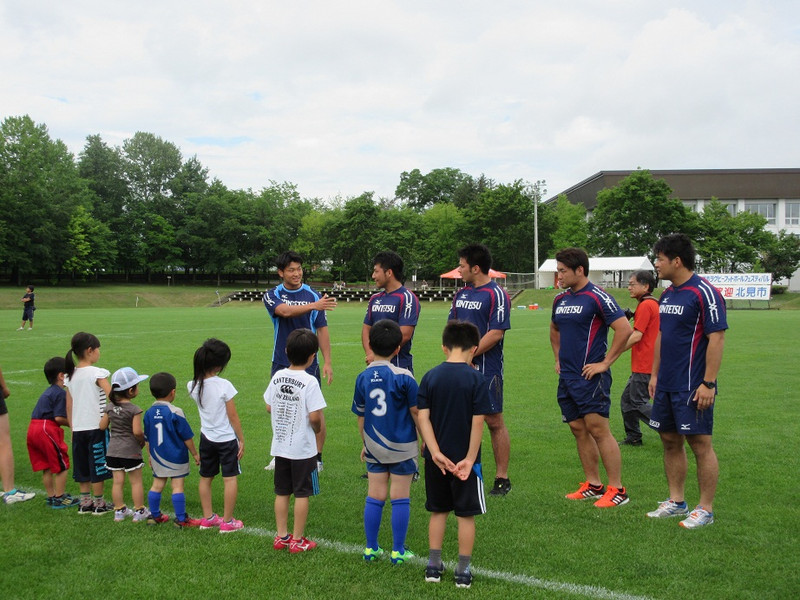 また、クボタ戦の前に地元・北見市で開催された「第30回 北見市ラグビーフットボールフェスティバル」での初心者タグラグビー教室(園児・小学生が対象)に、宮田選手・三原選手・王選手・田淵選手・萩原選手が講師として参加いたしました。