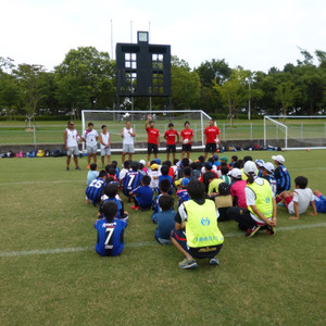 スポーツ教室1でサッカー希望の小学生にラグビーの説明をする選手たち