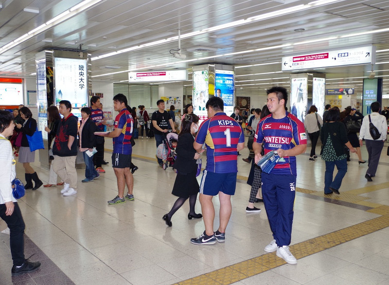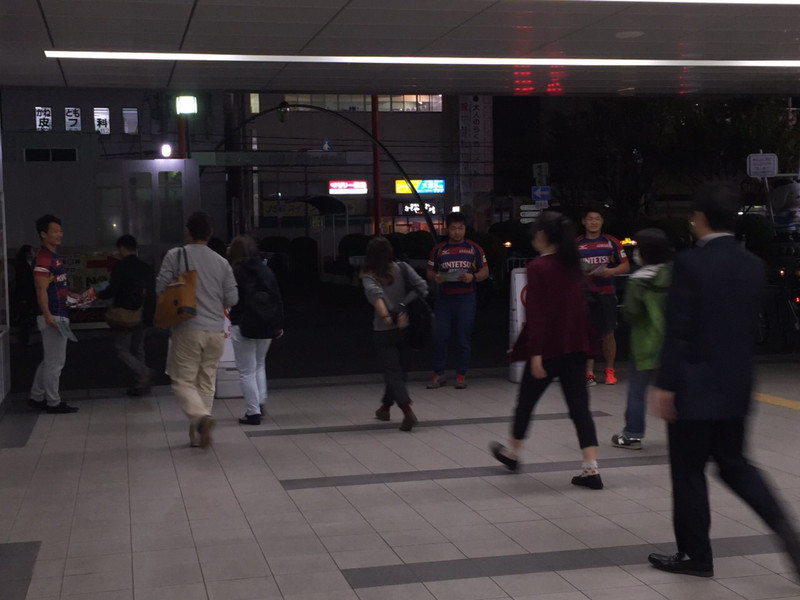 開幕戦に少しでも多くの方にお越しいただくため、この日、練習を終えたライナーズの選手たちが、東花園駅・布施駅・大阪難波駅の3箇所に分かれて家路につくお客様に声を掛けながらチラシを手渡しました。