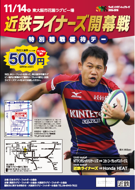 近鉄ライナーズでは、上記のトップリーグ開幕戦を500円で観戦できる(通常は1,600円)入場割引チラシを作成し、近鉄主要駅などに設置しています。