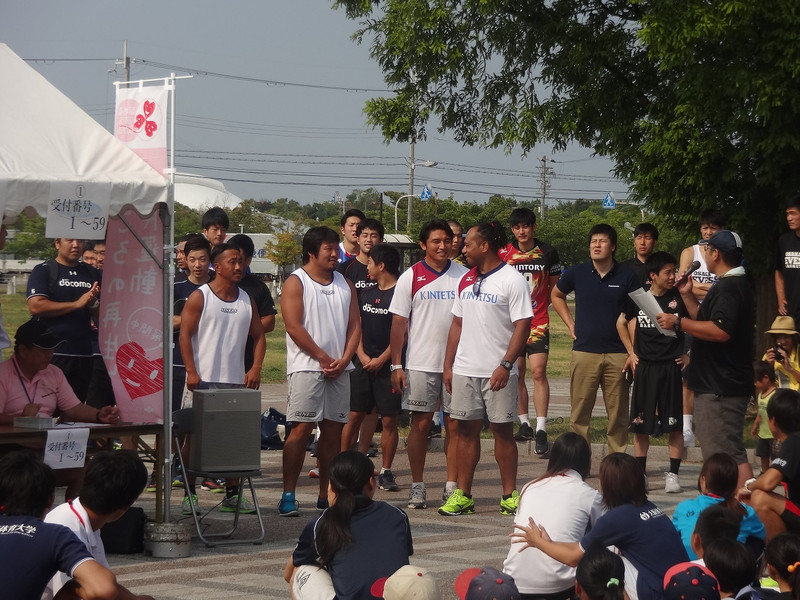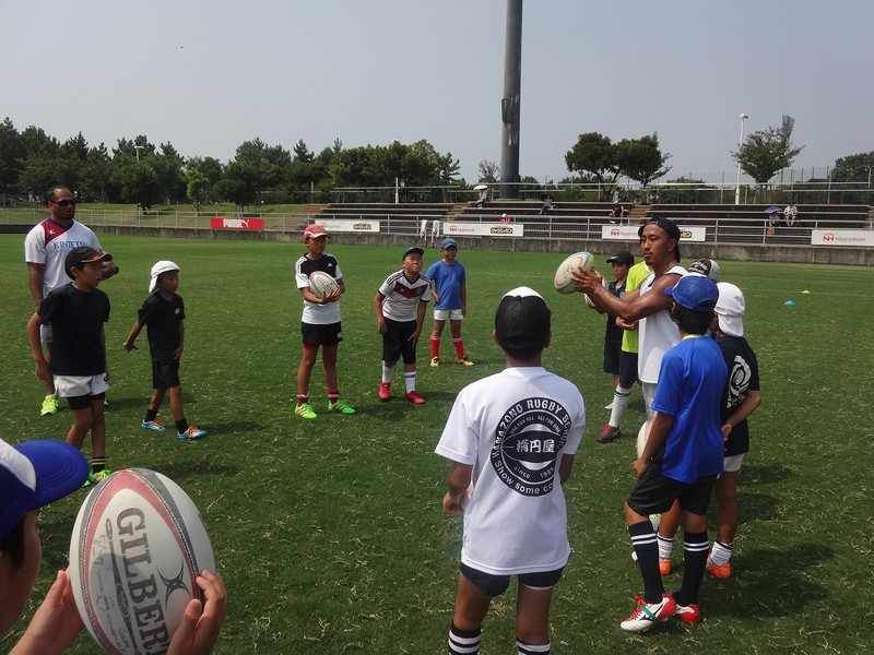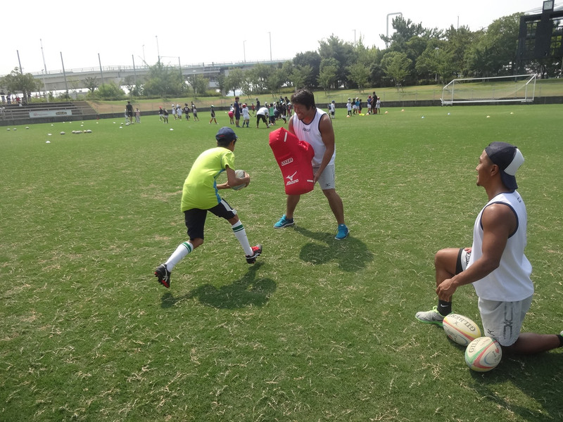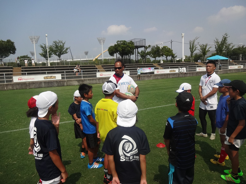 当日はNTTドコモレッドハリケーンズさんと共に行い、ラグビー希望の小学生96名を低学年(1,2,3年生)高学年(4,5,6年生)に分け、近鉄ライナーズは高学年を対象にラグビーの指導を行いました。