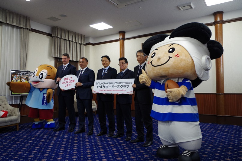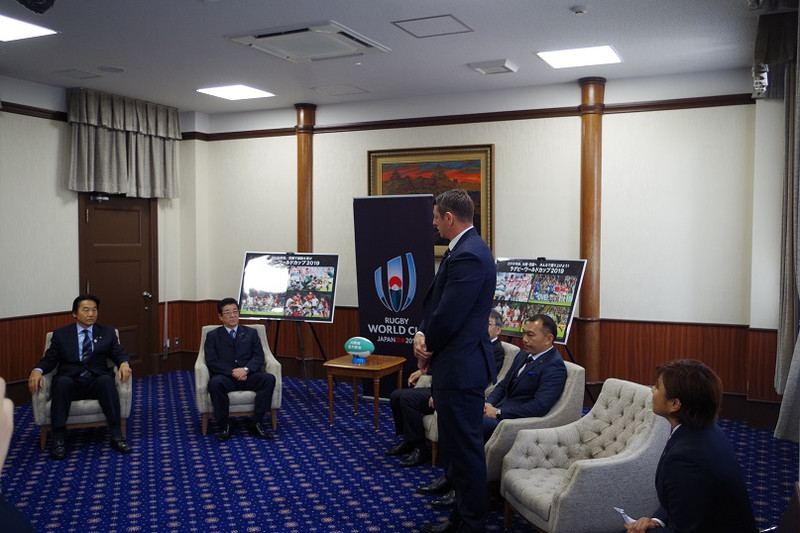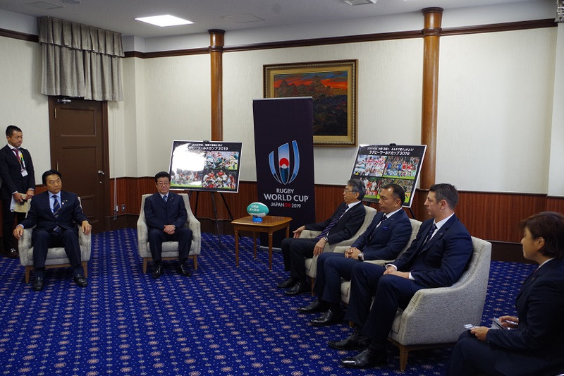 11月1日(火)近鉄ライナーズ、トンプソンルーク選手が、ラグビーワールドカップ2019、3年前のプロモーションとして元木由紀雄アンバサダーと共に、松井一郎大阪府知事、野田義和東大阪市長を表敬訪問しました。