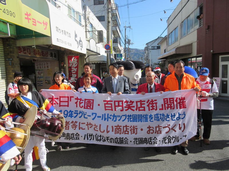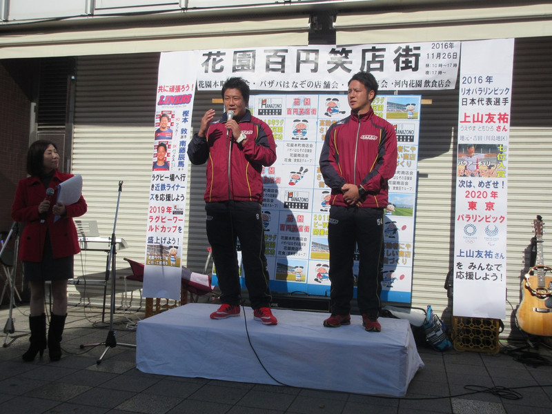 花園地区の商業団体によるイベント「花園・百円笑店街」のオープニングセレモニーに、ライナーズの樫本選手、南藤選手が参加しました。