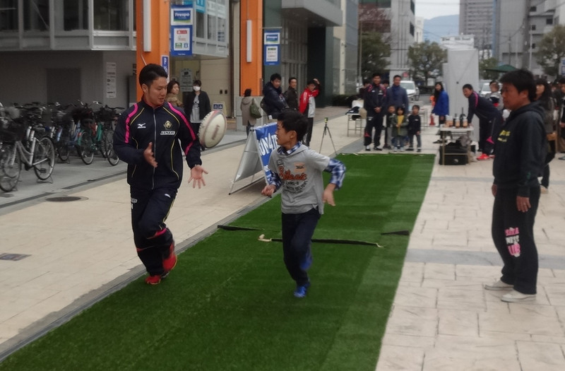 後半からは浅岡選手、尾池選手も登場。ラグビー体験コーナーで会場に遊びに来てくれていた皆様にラインアウトやコンタクトの体験を行ってもらいました。