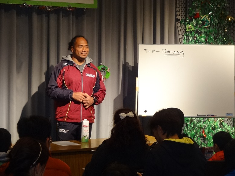 「夢を持つことの大切さ」というテーマで、タウファ選手のこれまでの人生の話を交えながら夢を持ちそれを叶える為の「課程」を自分でしっかりと考え、自分を「信じる」そして自分に「正直」に夢に向かって「挑戦」し続けることの大切さを語りました。