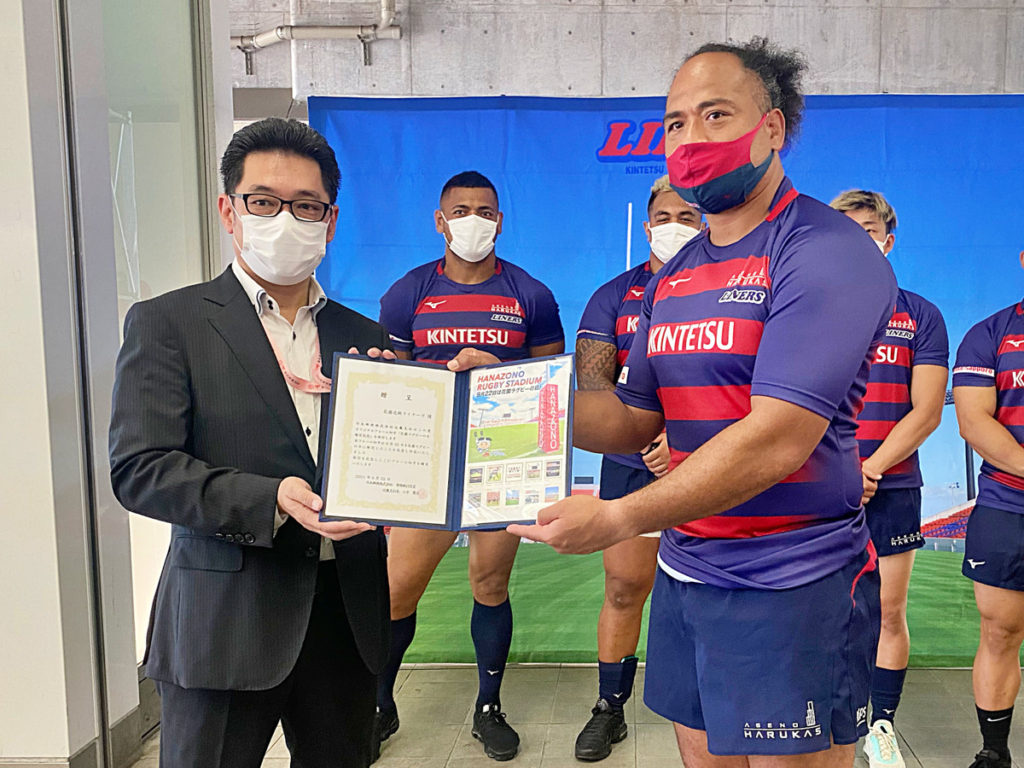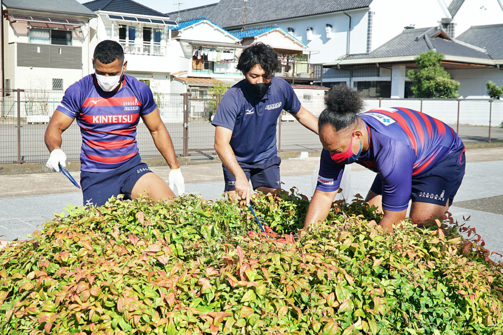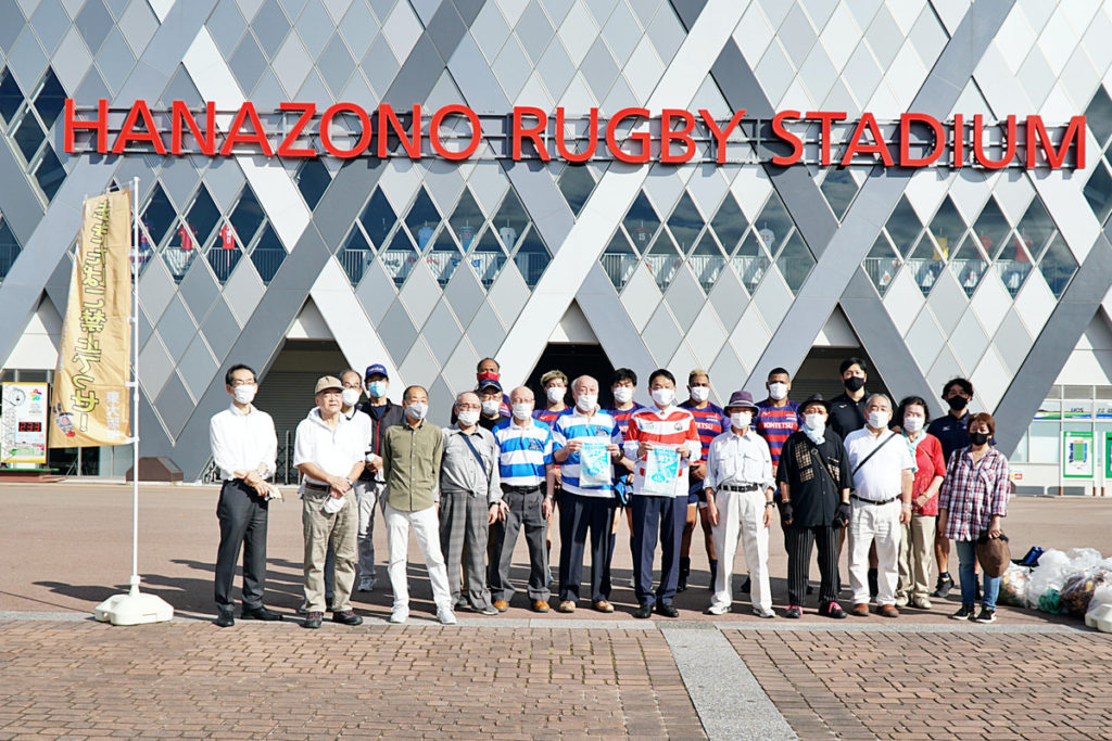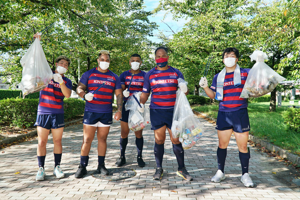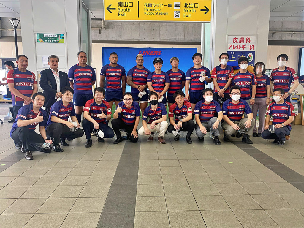 本日9月22日(水)、「まちの美化推進重点区域指定に係るセレモニー」の一環で行われた花園ラグビー場周辺の清掃活動および近鉄東花園駅で行われた「花園ラグビーの日」制定記念イベントに、花園近鉄ライナーズの選手・スタッフが参加しました。