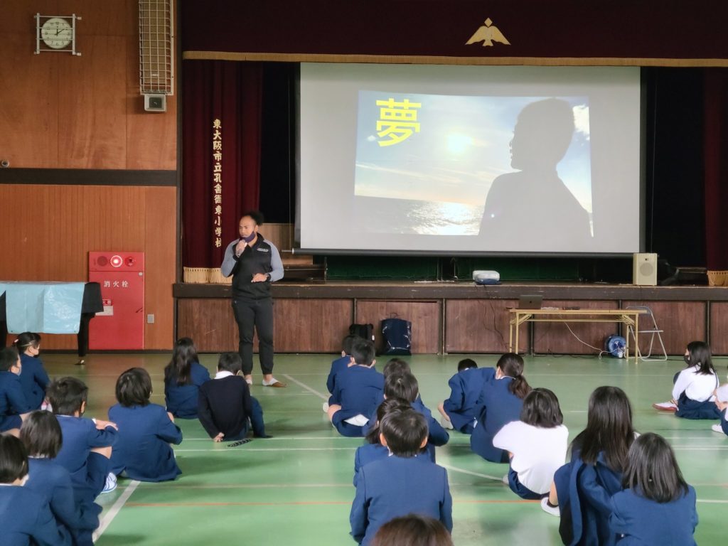 11月11日、東大阪市との連携事業「ラグビーのまちスクラム事業」の一環で、東大阪市孔舎衙東(くさかひがし)小学校にて講話を行いました。