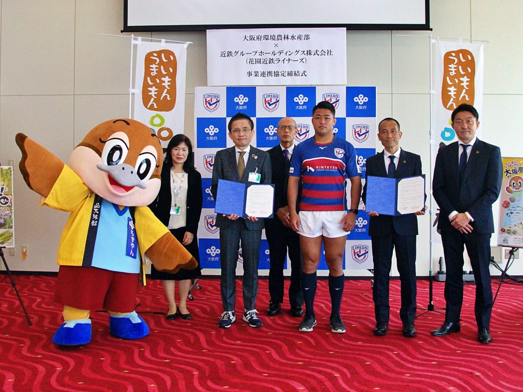 11月18日、大阪府環境農林水産部と近鉄グループホールディングス株式会社は、大阪産(もん)の普及、花園近鉄ライナーズの認知度向上及び食とスポーツを通じた地域活性化において相互の発展のために協定を締結しました。