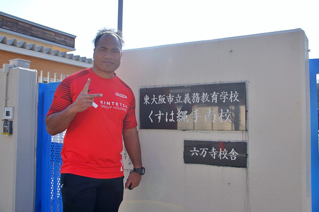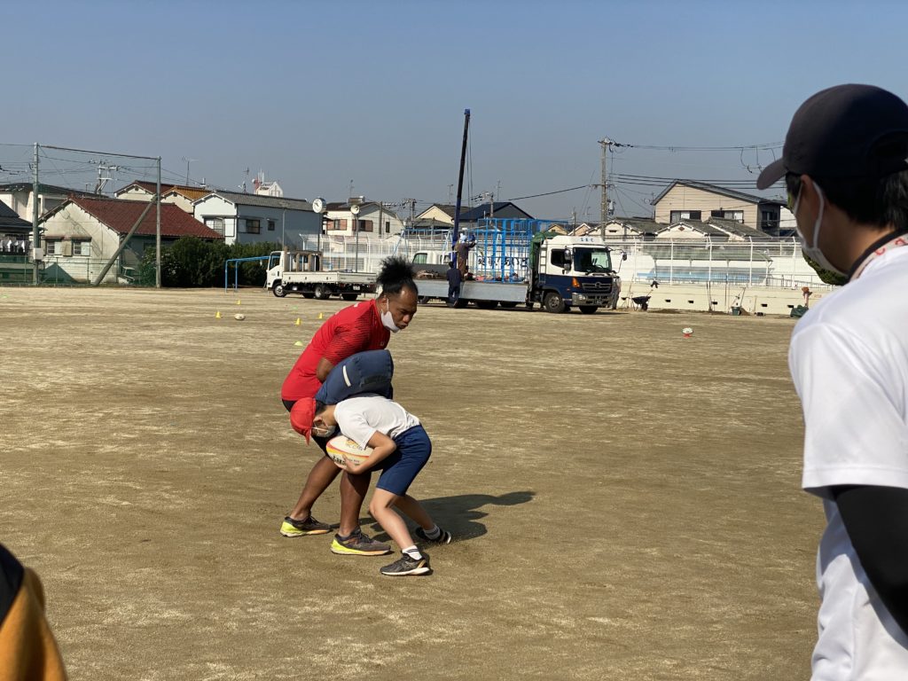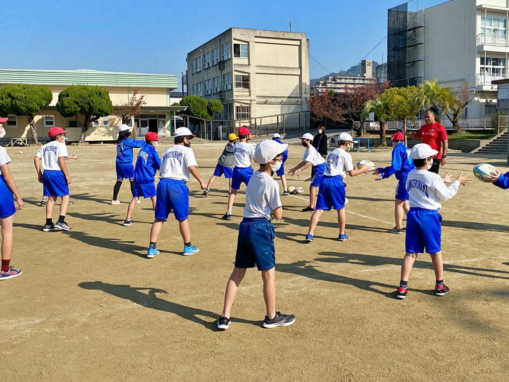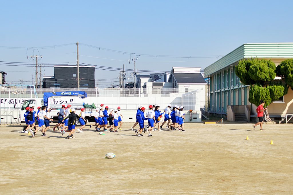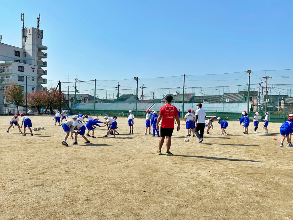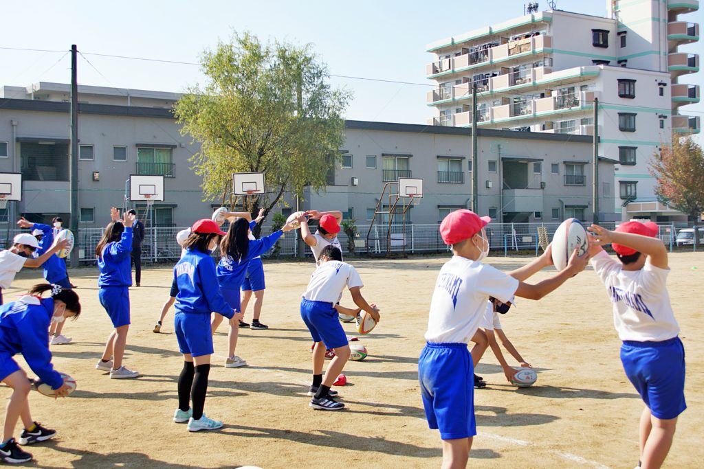 11月15日、東大阪市との連携事業「ラグビーのまちスクラム事業」の一環で、東大阪市立義務教育学校くすは縄手南校前期課程にてラグビー体験を行いました。