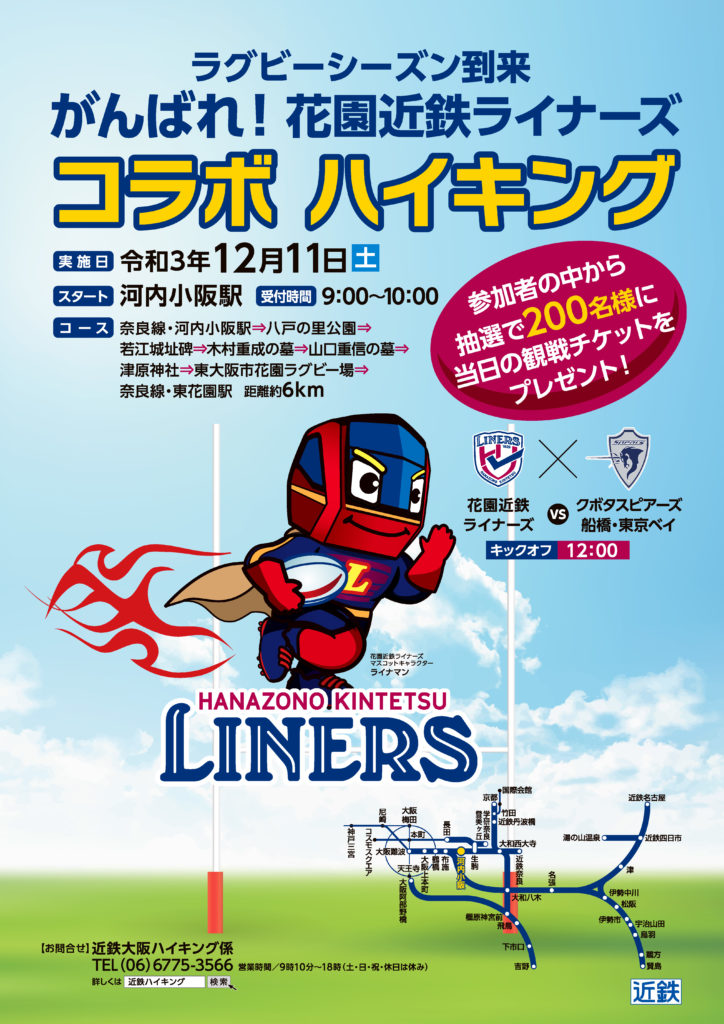 12月11日(土)、「がんばれ!花園近鉄ライナーズ コラボ ハイキング」が開催されます。