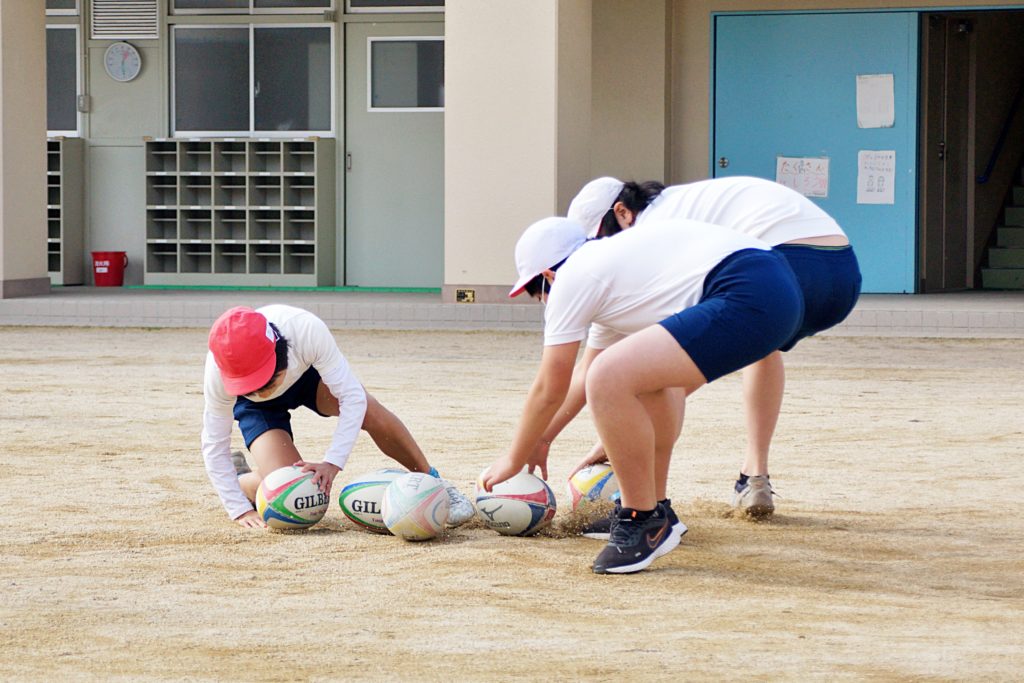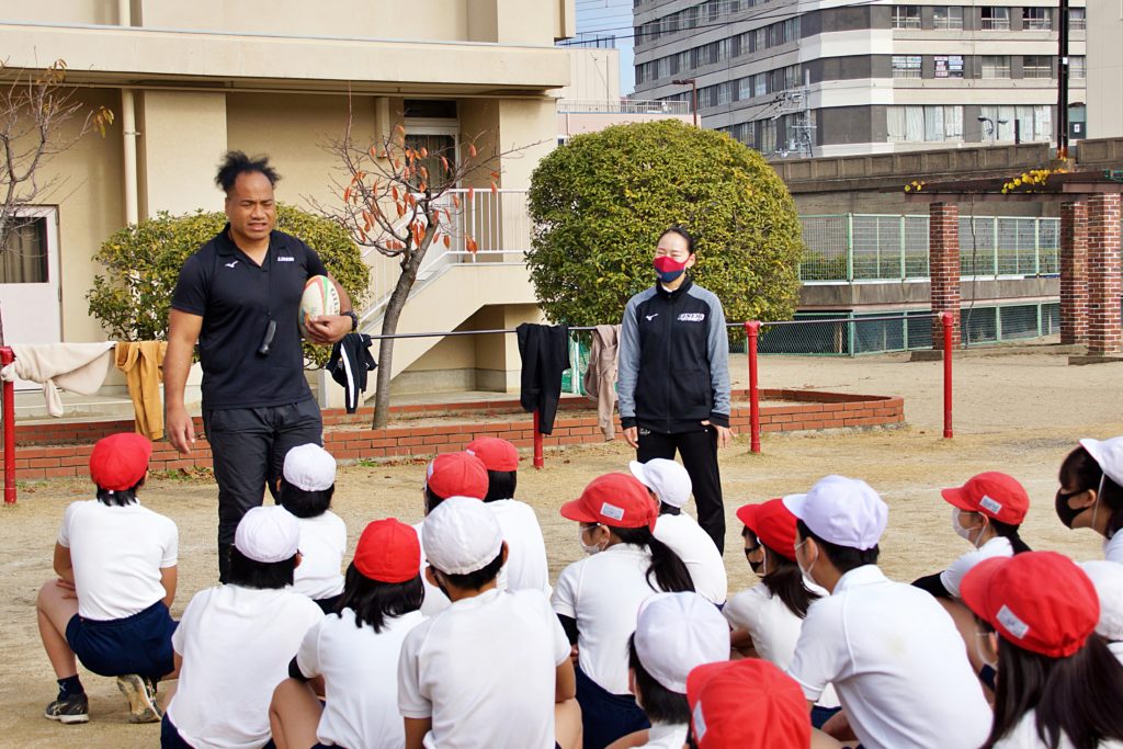 12月10日(金)、大阪府が主導する「トップアスリート小学校ふれあい事業」の一環で、大阪市立岸里小学校にてラグビー体験を行いました。