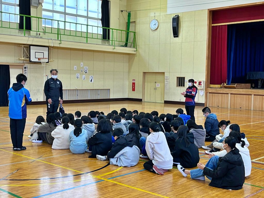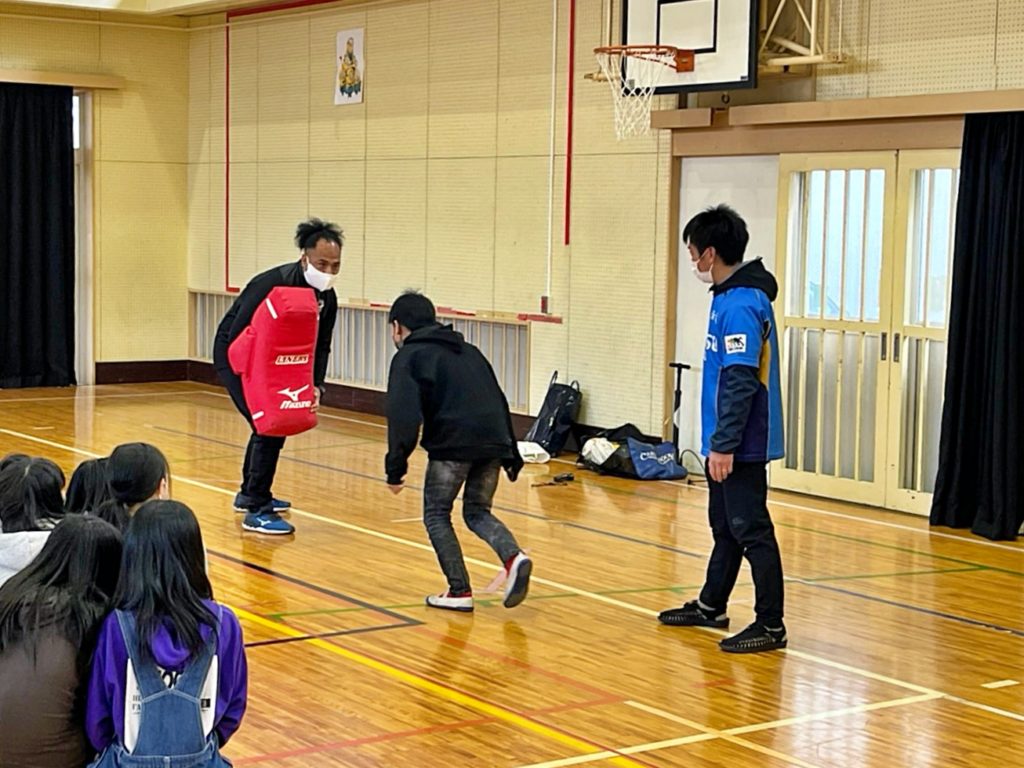 この日は6年生を対象に、はじめに教室で「本気でチャレンジすることの大切さ」について講話を行い、その後体育館に移動してラグビー体験を実施しました。