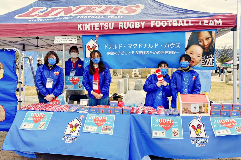 同日東大阪市花園ラグビー場にて開催の三重ホンダヒート戦では、「花園ハッピーパーク」内にDMHCブースが登場。寄付を募り、多くの方にご協力いただきました。