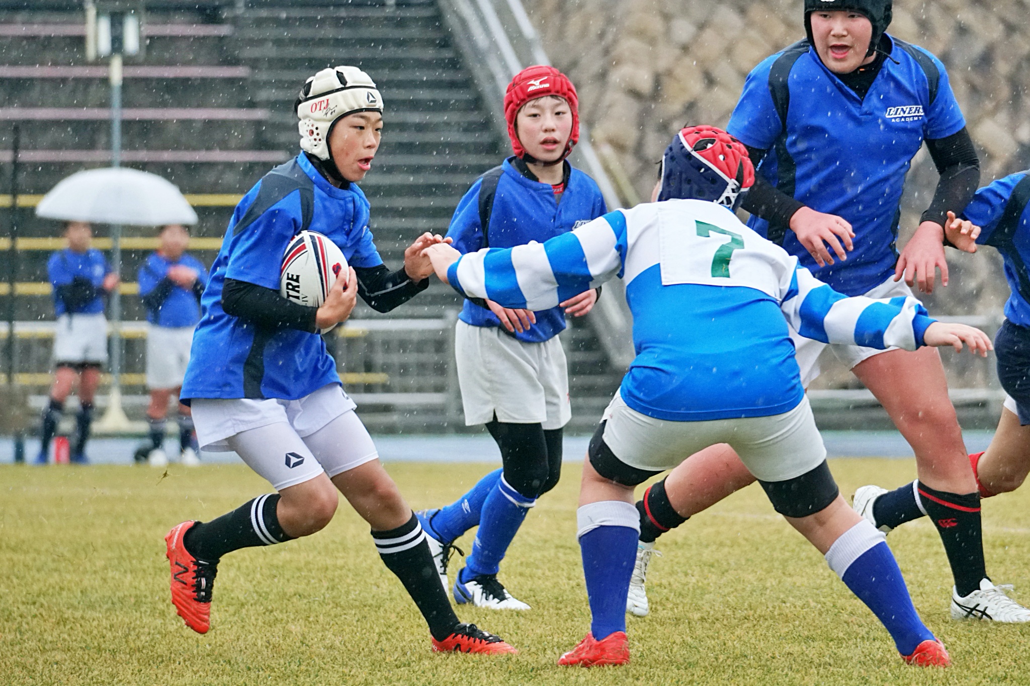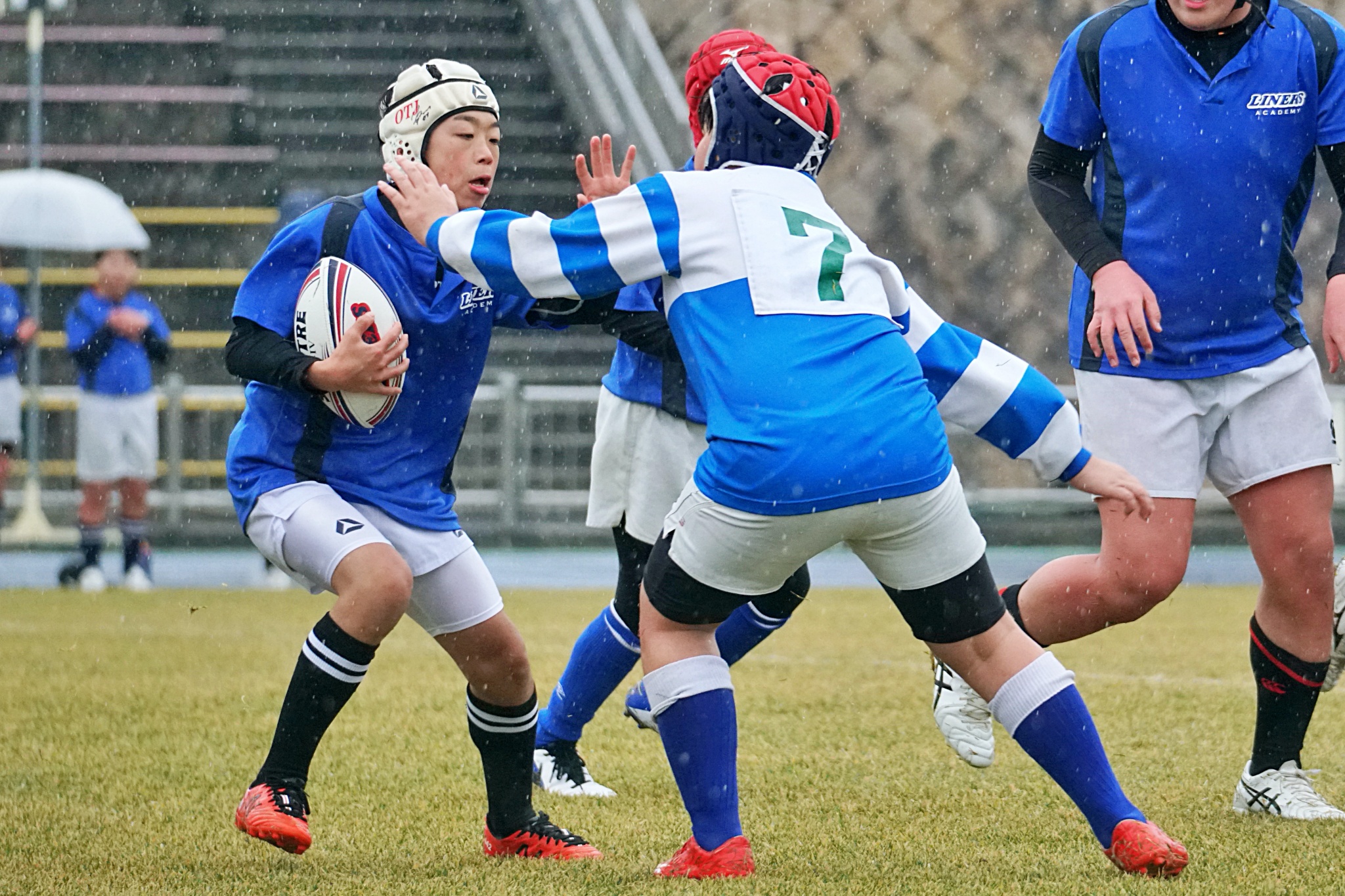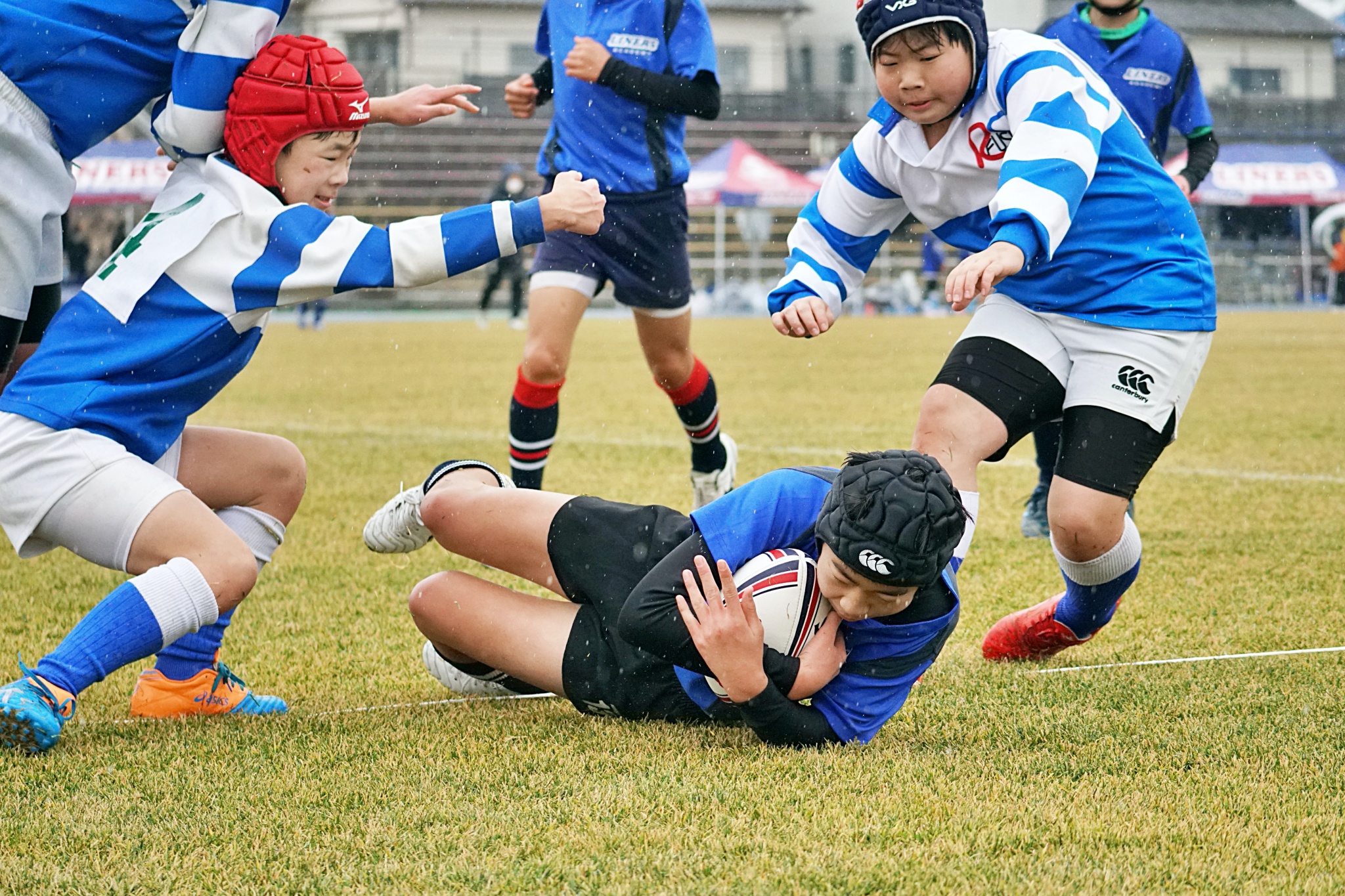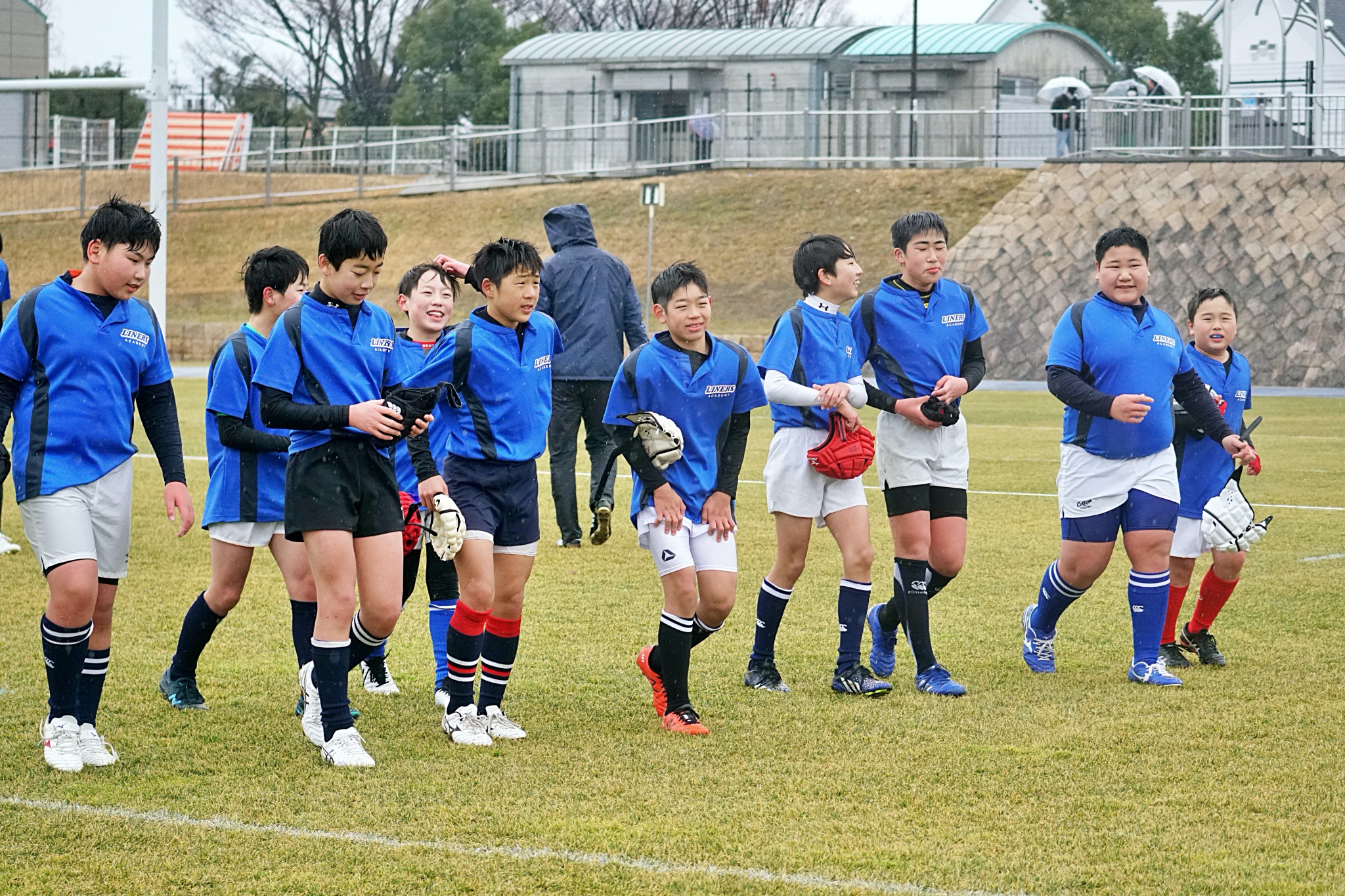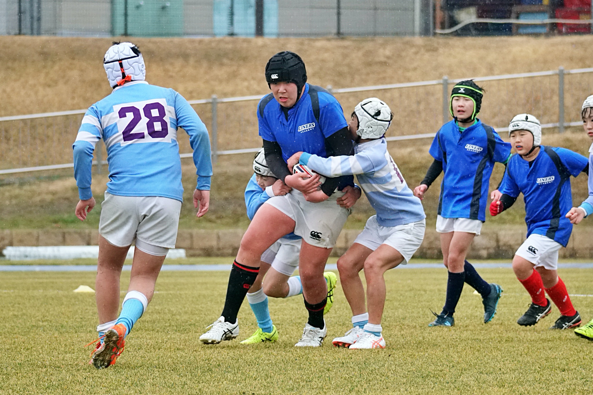 ライナーズアカデミー、東大阪KINDAIクラブラグビースクール、花園ラグビースクール、布施ラグビースクールの4チームの6年生が参加。