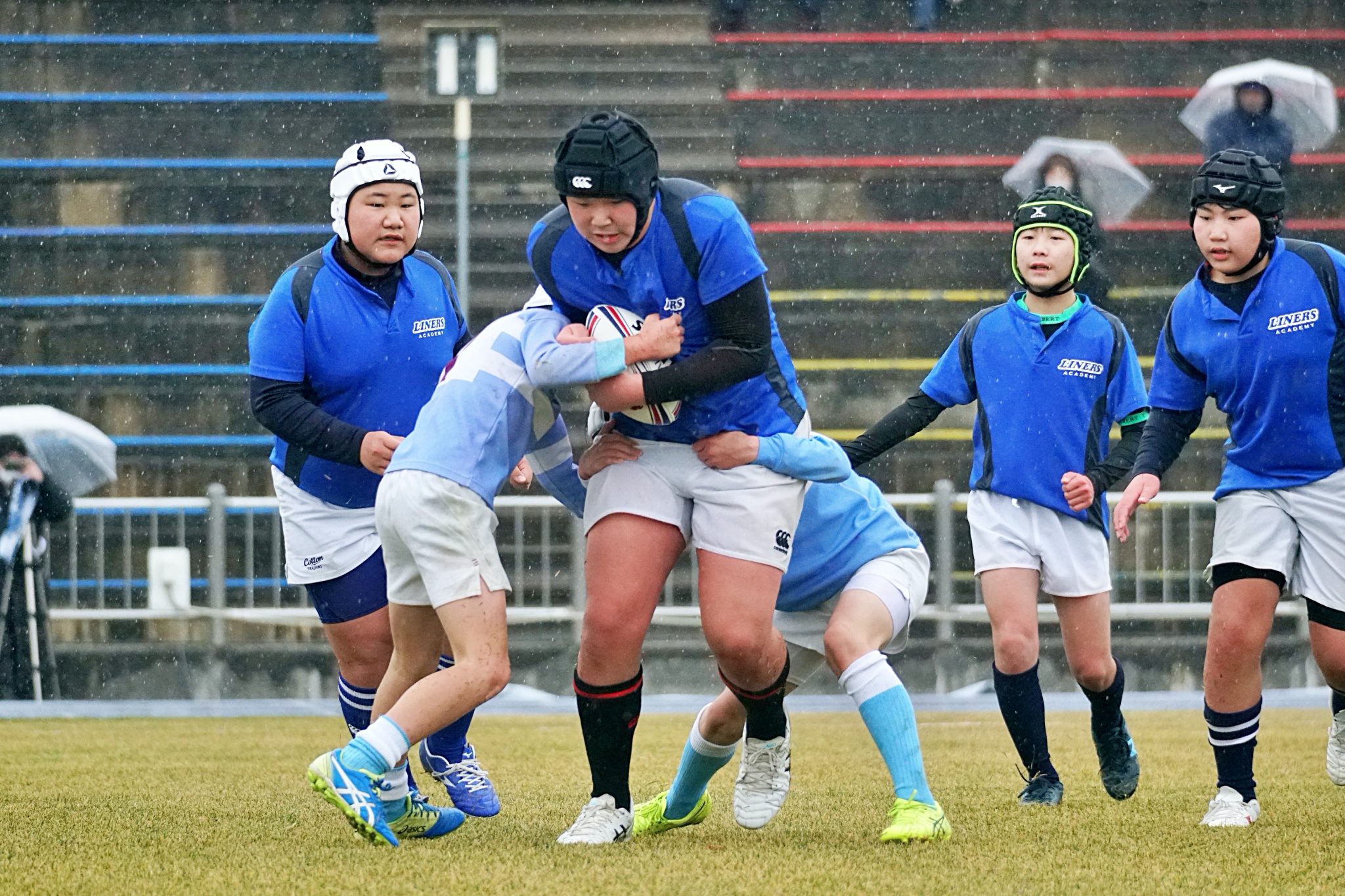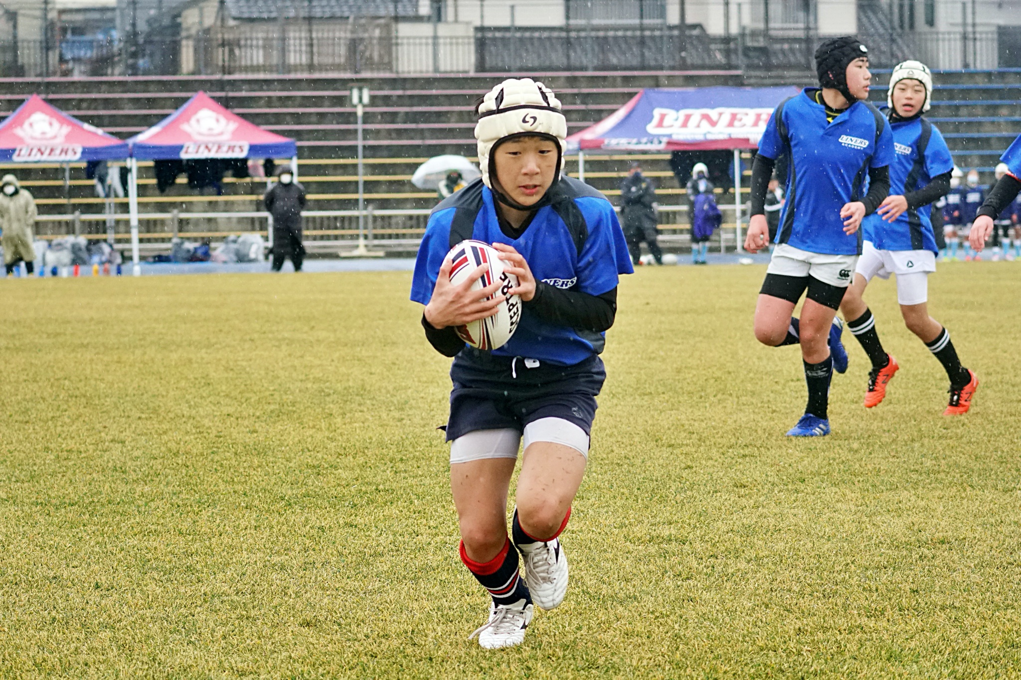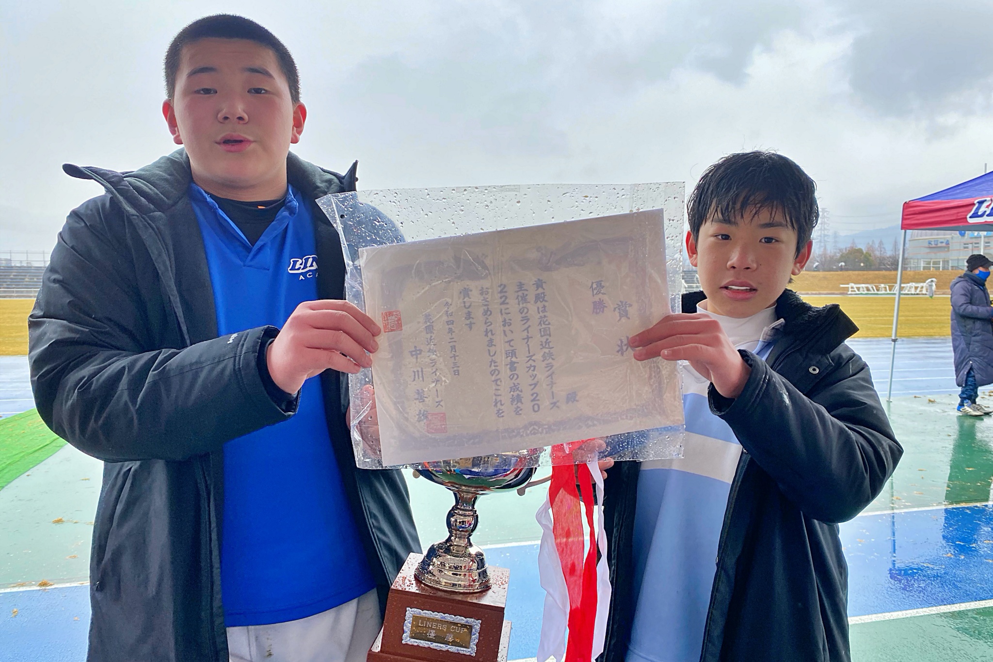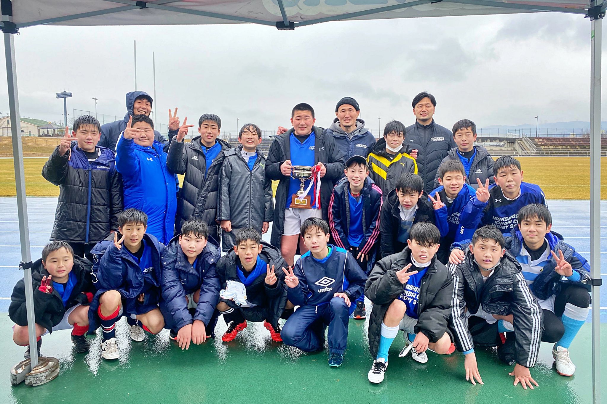ライナーズアカデミーは1回戦で布施RSに勝利。決勝戦では東大阪KINDAIクラブRSと対戦し、お互いに4本ずつトライを奪い、同点優勝でした。