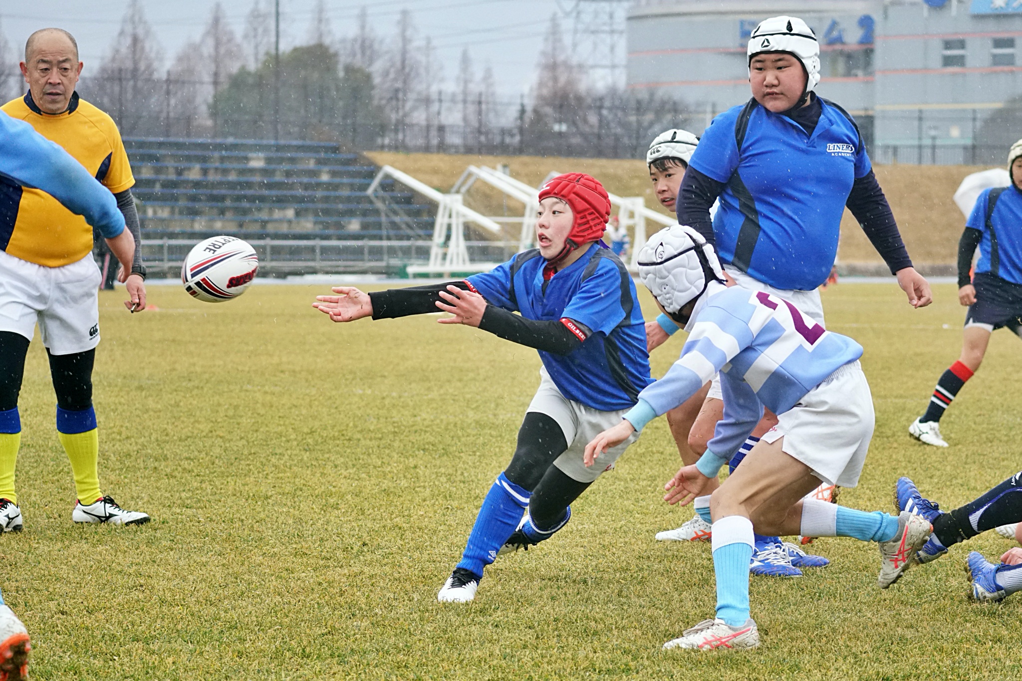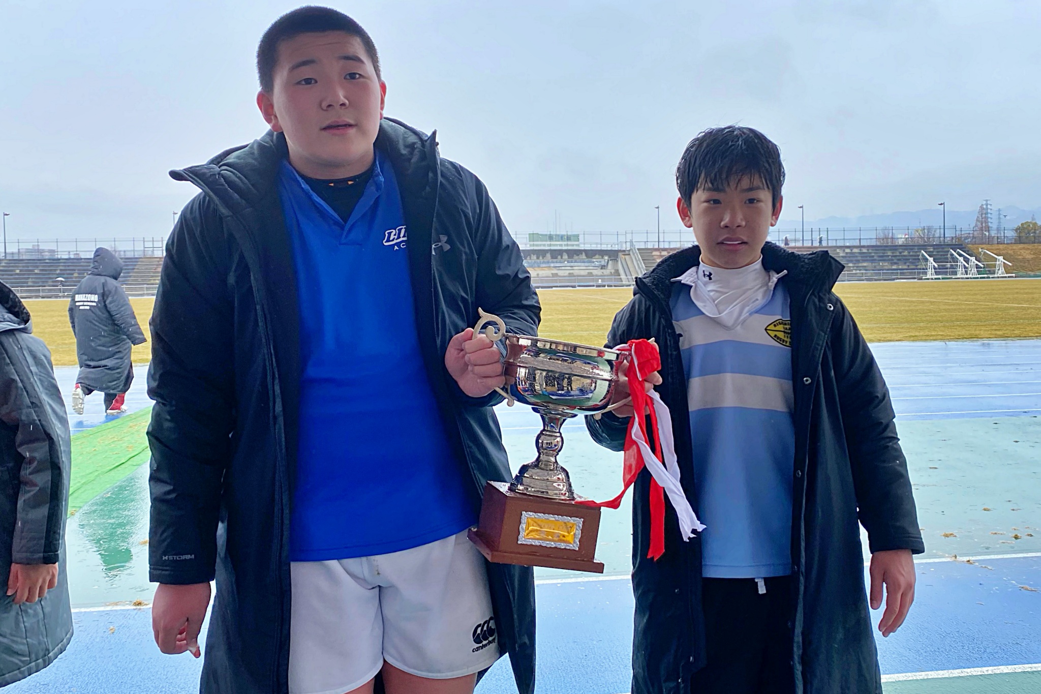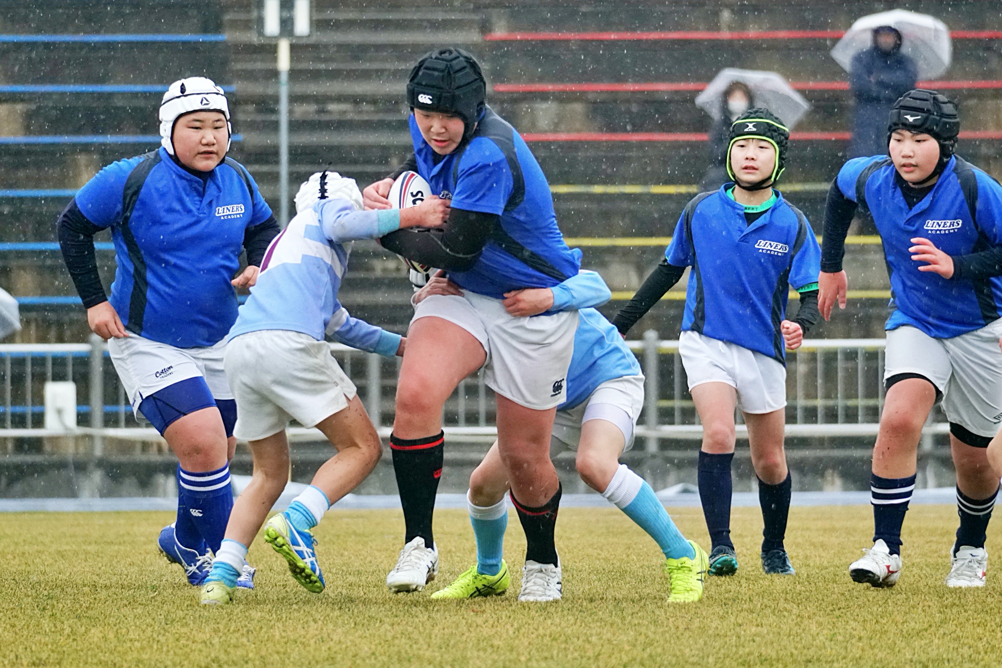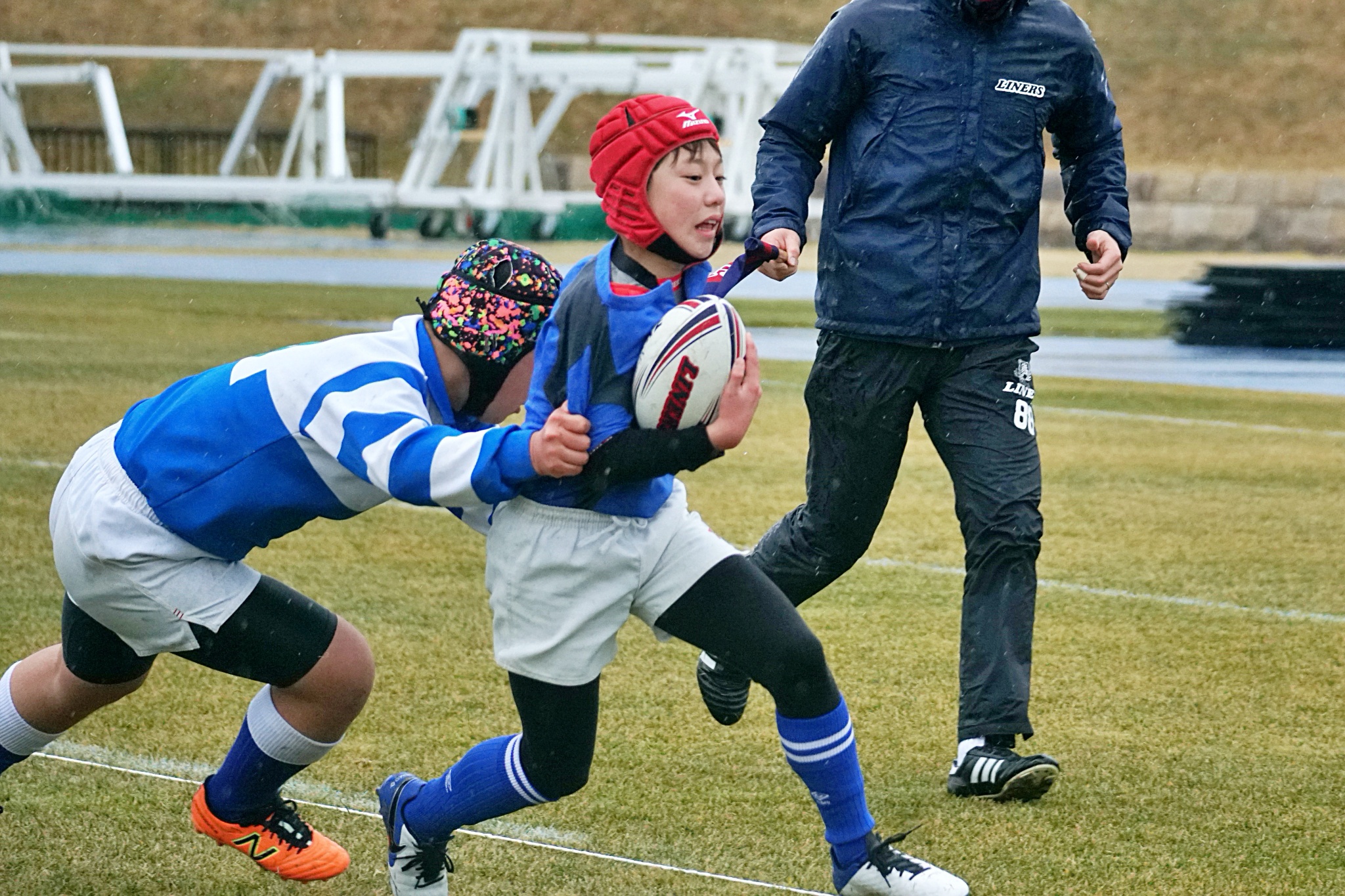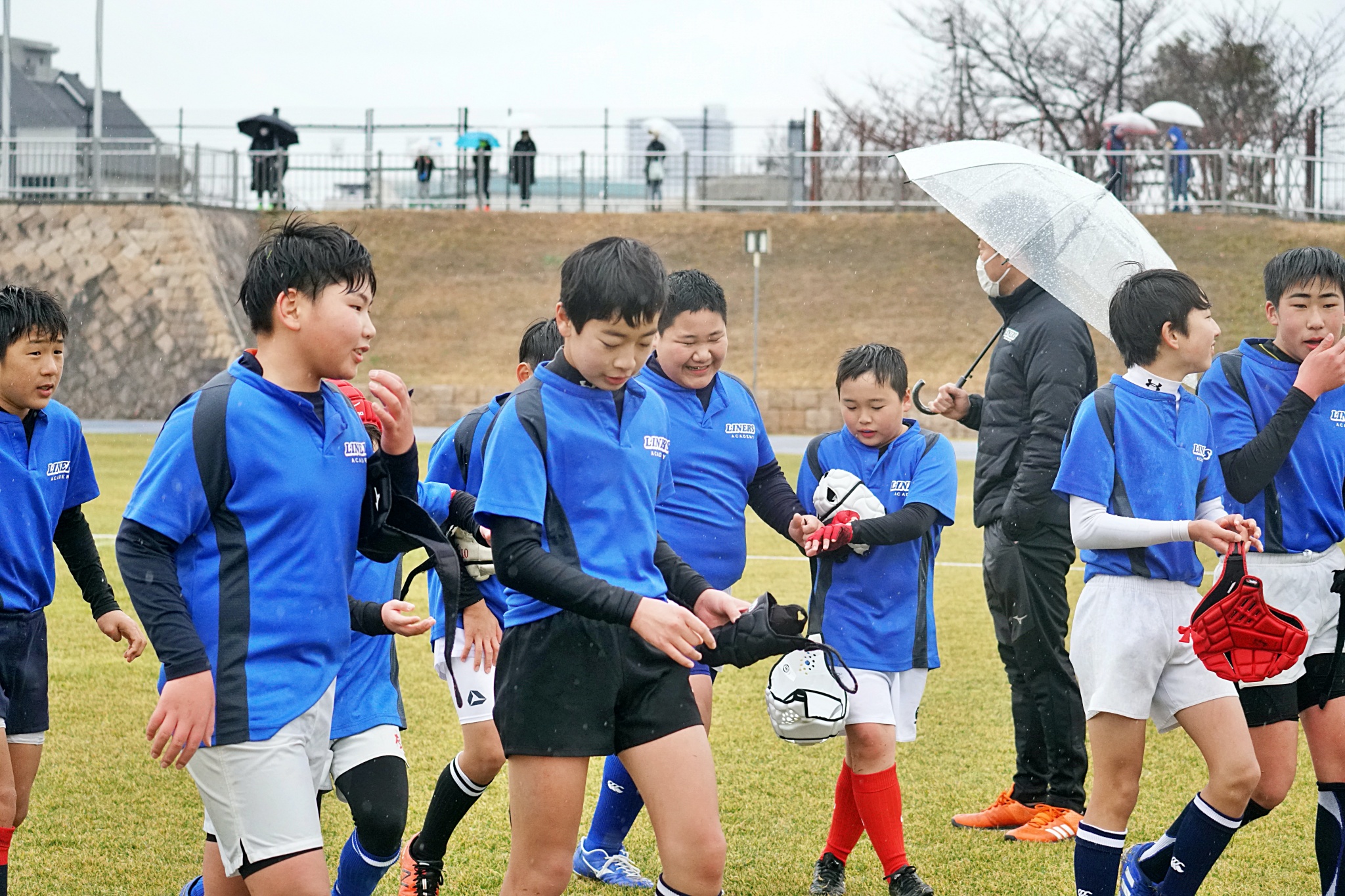 ライナーズアカデミーは1回戦で布施RSに勝利。決勝戦では東大阪KINDAIクラブRSと対戦し、お互いに4本ずつトライを奪い、同点優勝でした。