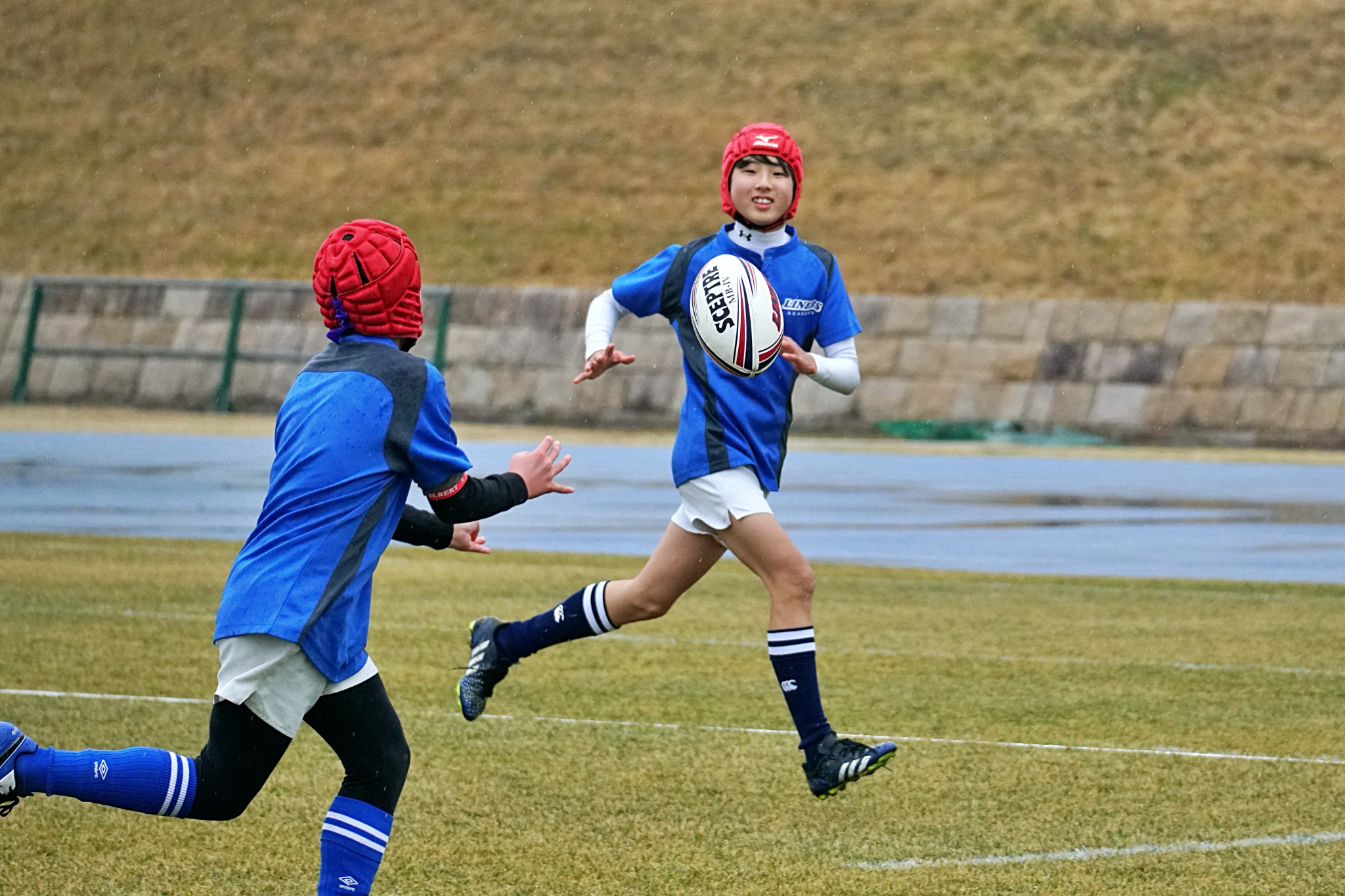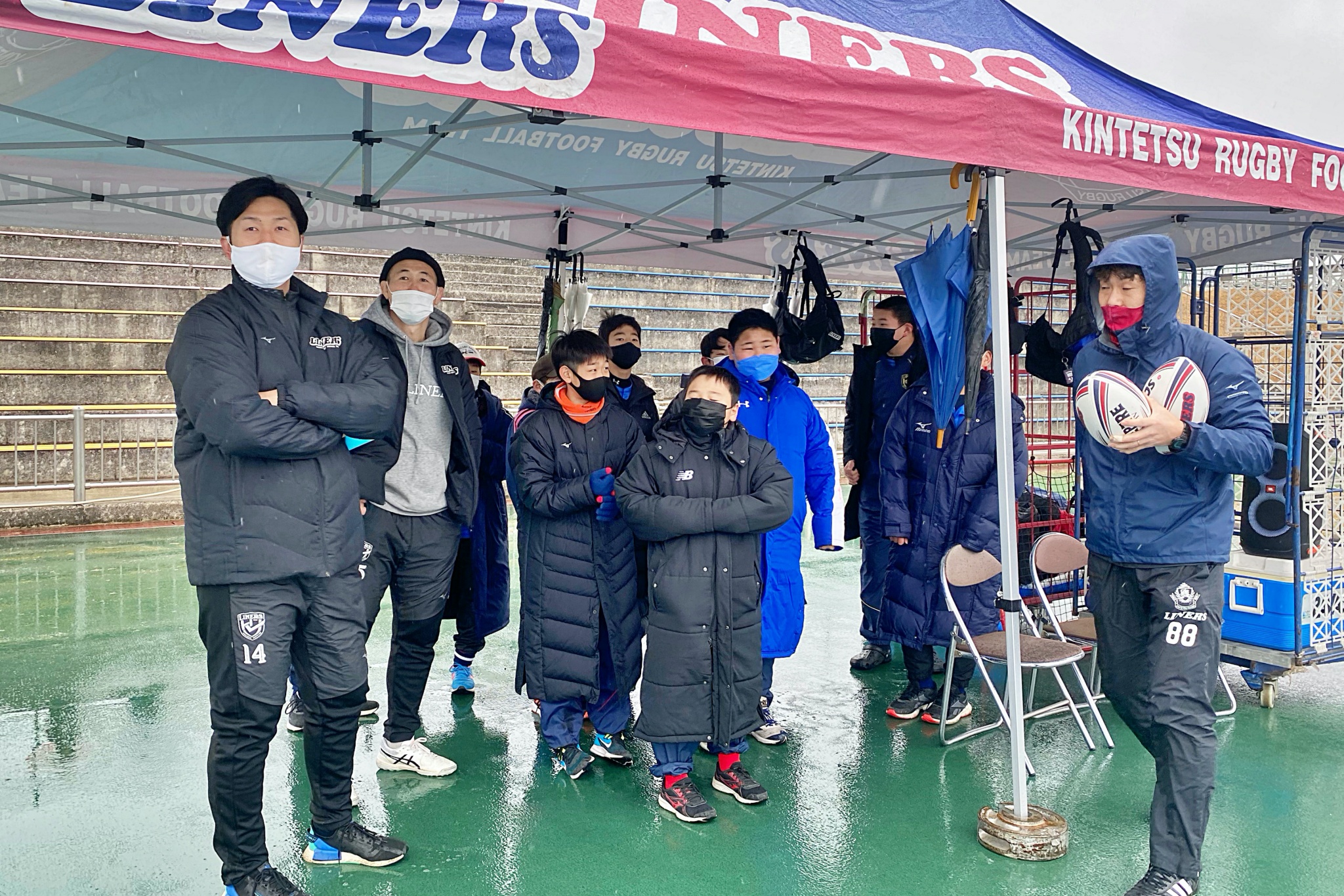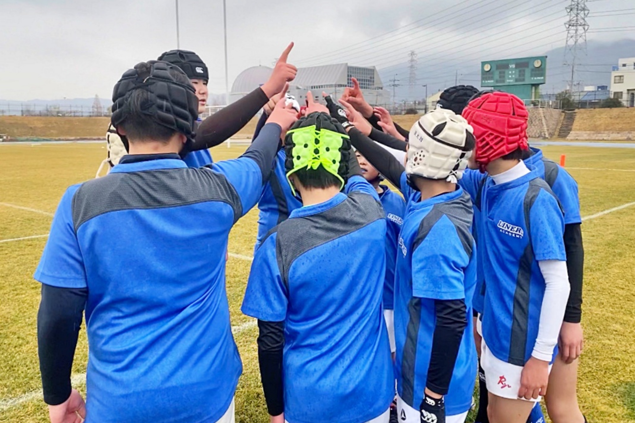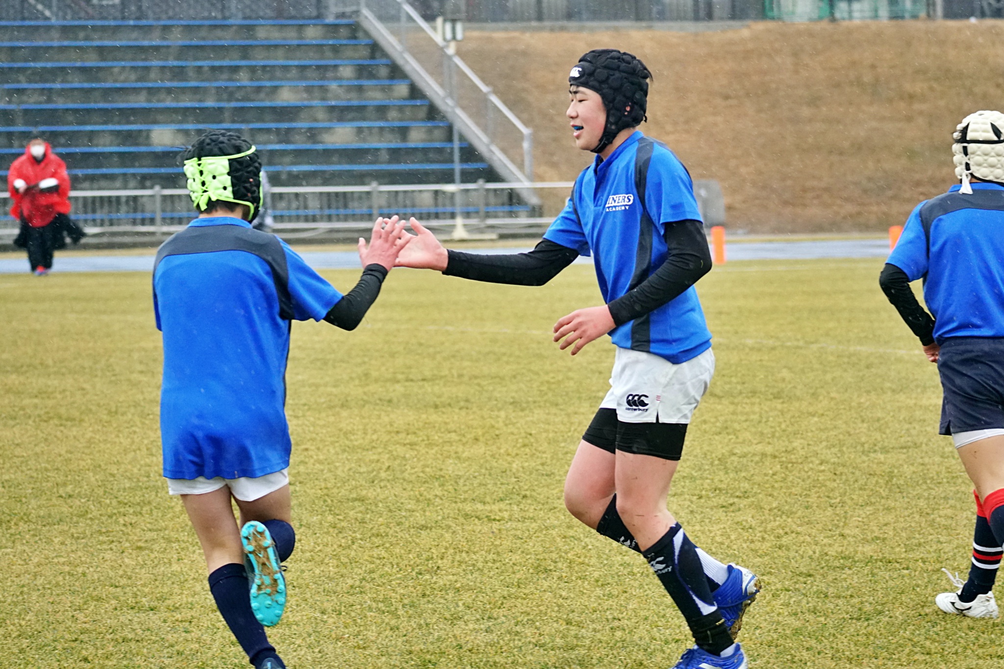 ライナーズアカデミーは1回戦で布施RSに勝利。決勝戦では東大阪KINDAIクラブRSと対戦し、お互いに4本ずつトライを奪い、同点優勝でした。