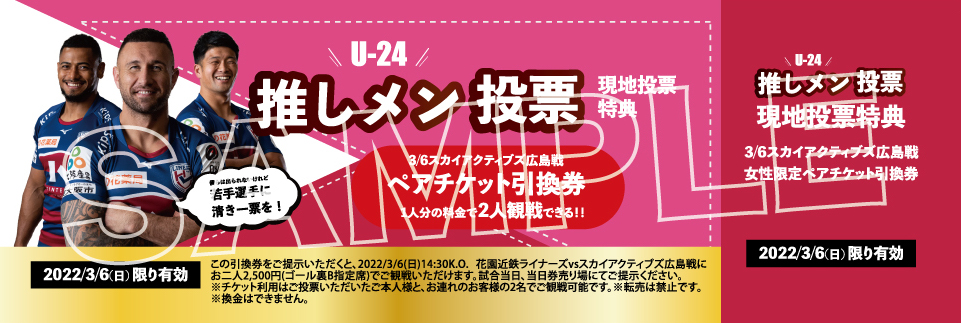 2月19日(土)東大阪市花園ラグビー場にて開催の花園ハッピーパークで会場投票をしていただいた女性に限り、「ペアチケット引換券」をプレゼントします。