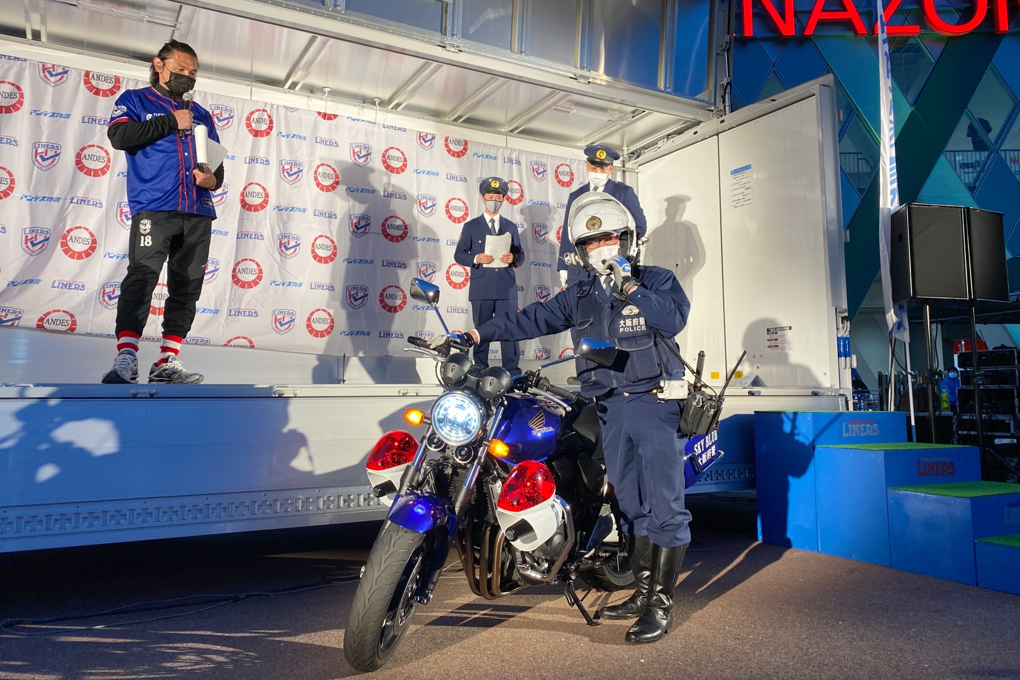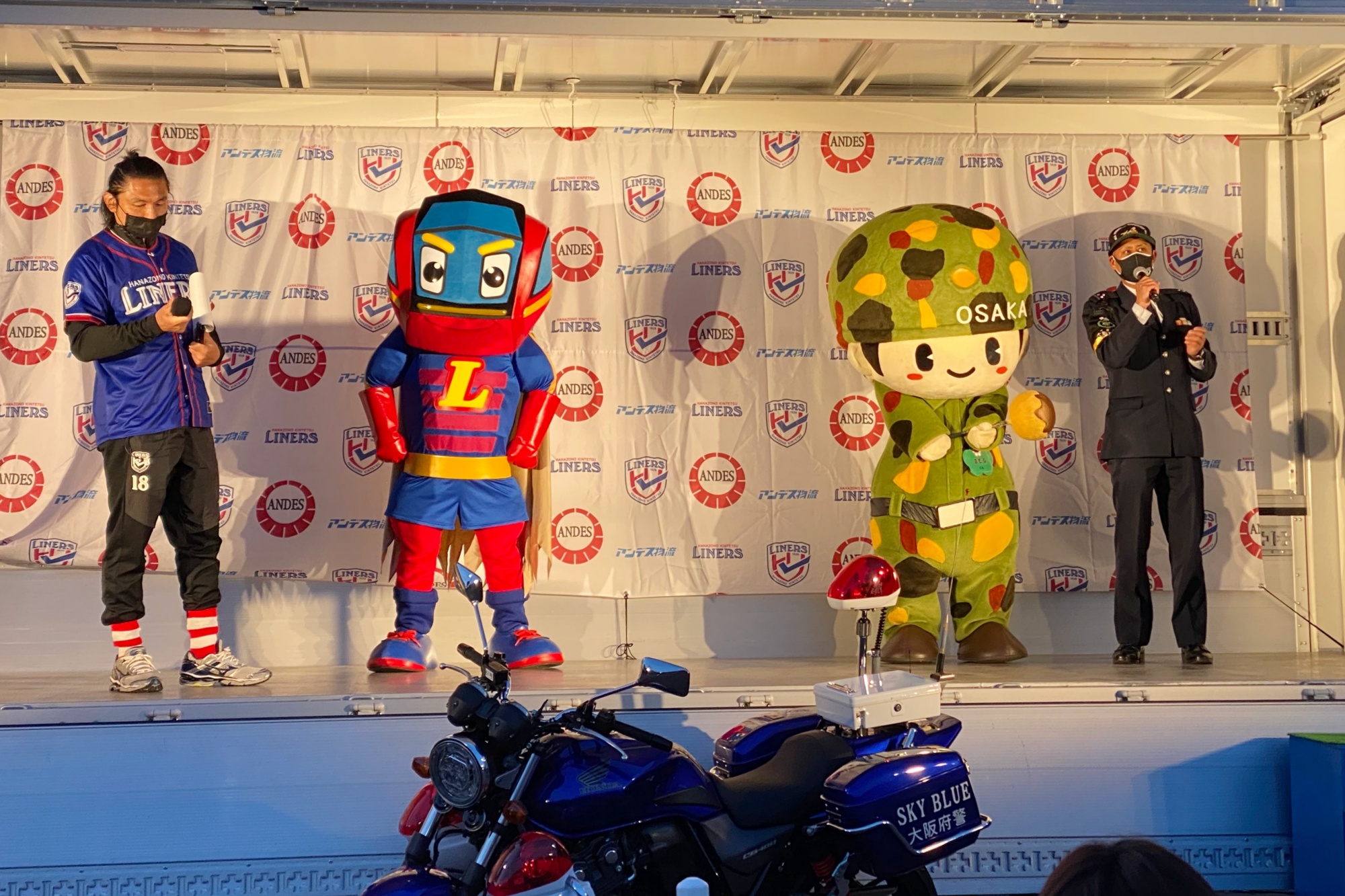 司会進行は伊藤太進セールスマネージャーが務めました。ウィル・ゲニア選手、タウファ統悦普及担当、伊藤太進セールスマネージャーによるオープニングトークほか、ライナーズのオフィシャルサポートソングを歌うボーカルユニット「HAND DRIP」のミニライブ、 自衛隊大阪地方協力本部PR、河内警察署PRを行いました。