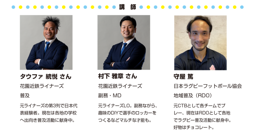 また、第2グラウンドイベントとして、花園近鉄ライナーズと日本ラグビーフットボール協会RDO守屋篤さんによるラグビー体験会が開催されます。