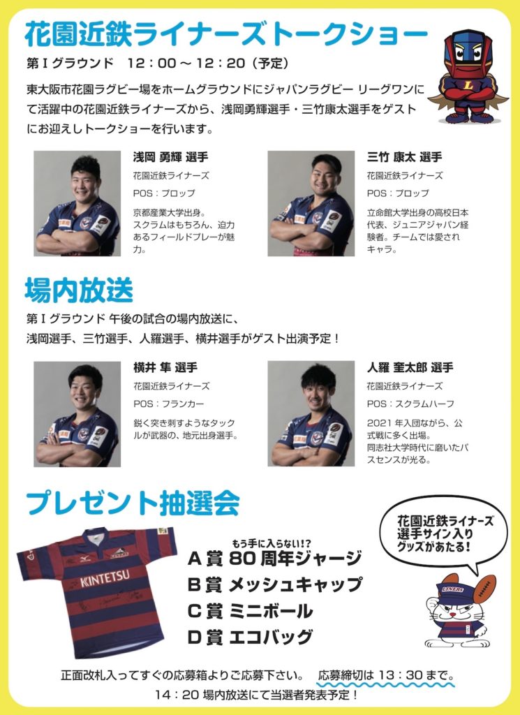 4月17日(日)開催のサンコーインダストリーPresents2022関西セブンズフェスティバルにて、花園近鉄ライナーズトークショー、場内放送、プレゼント抽選会が実施されます。