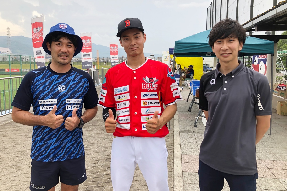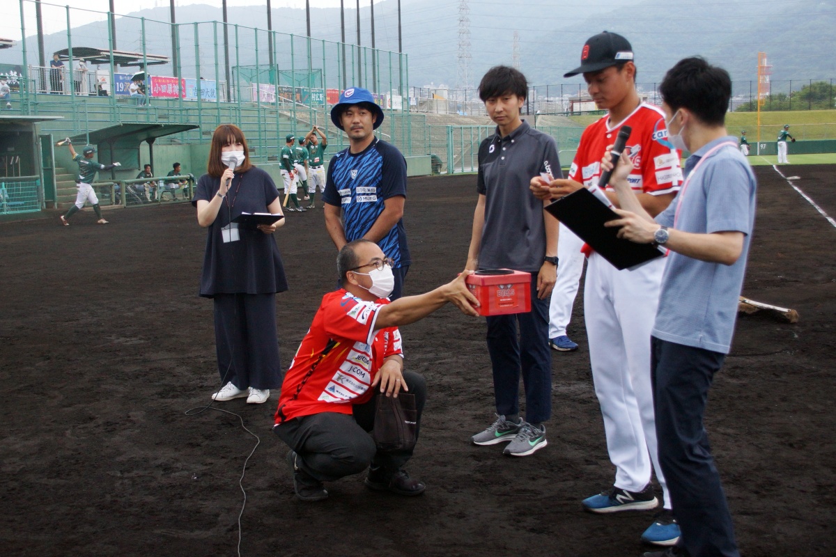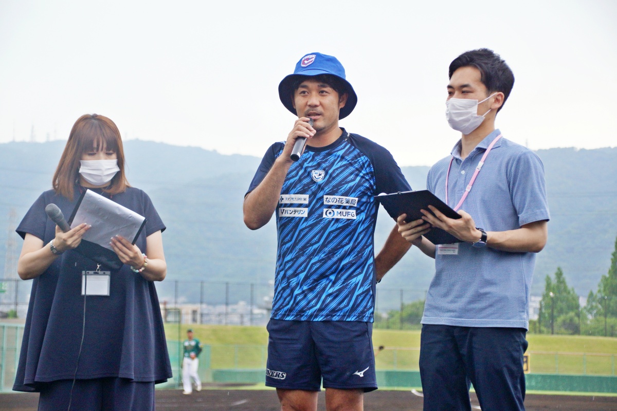 6月25日(土)花園近鉄ライナーズは、花園セントラルスタジアムにホームスタジアムをもつ野球チーム・06BULLSの始球式に参加しました。