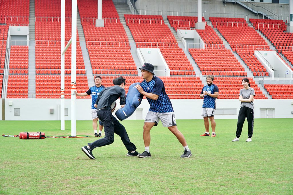 講師をHO樫本敦選手、FL野中翔平選手、FB竹田宜純選手にバトンタッチ。パスやタックルなどを体験してもらいました。