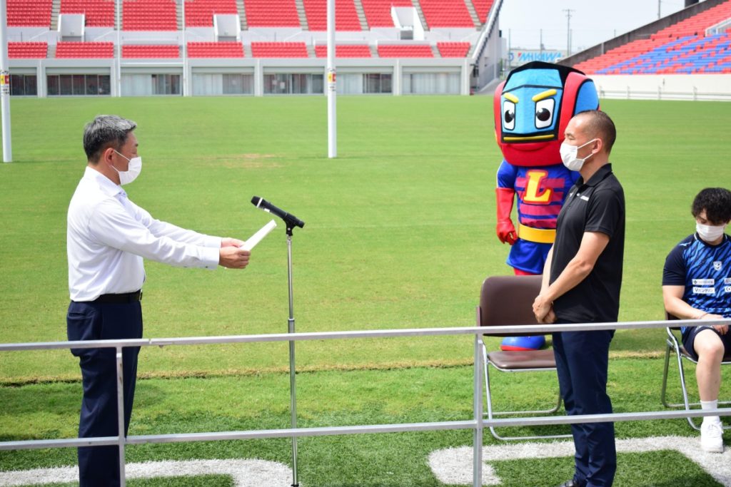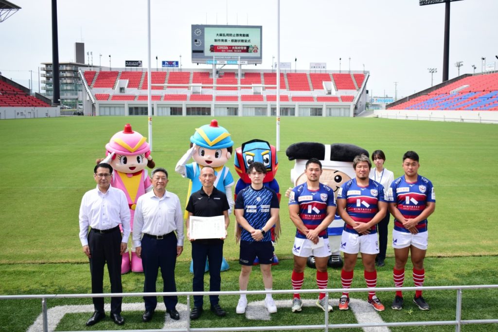 この度花園近鉄ライナーズでは、大阪府警察本部による薬物乱用防止啓発動画の制作に協力し、その制作発表・感謝状の贈呈式が7月18日(月祝)東大阪市花園ラグビー場にて行われました。