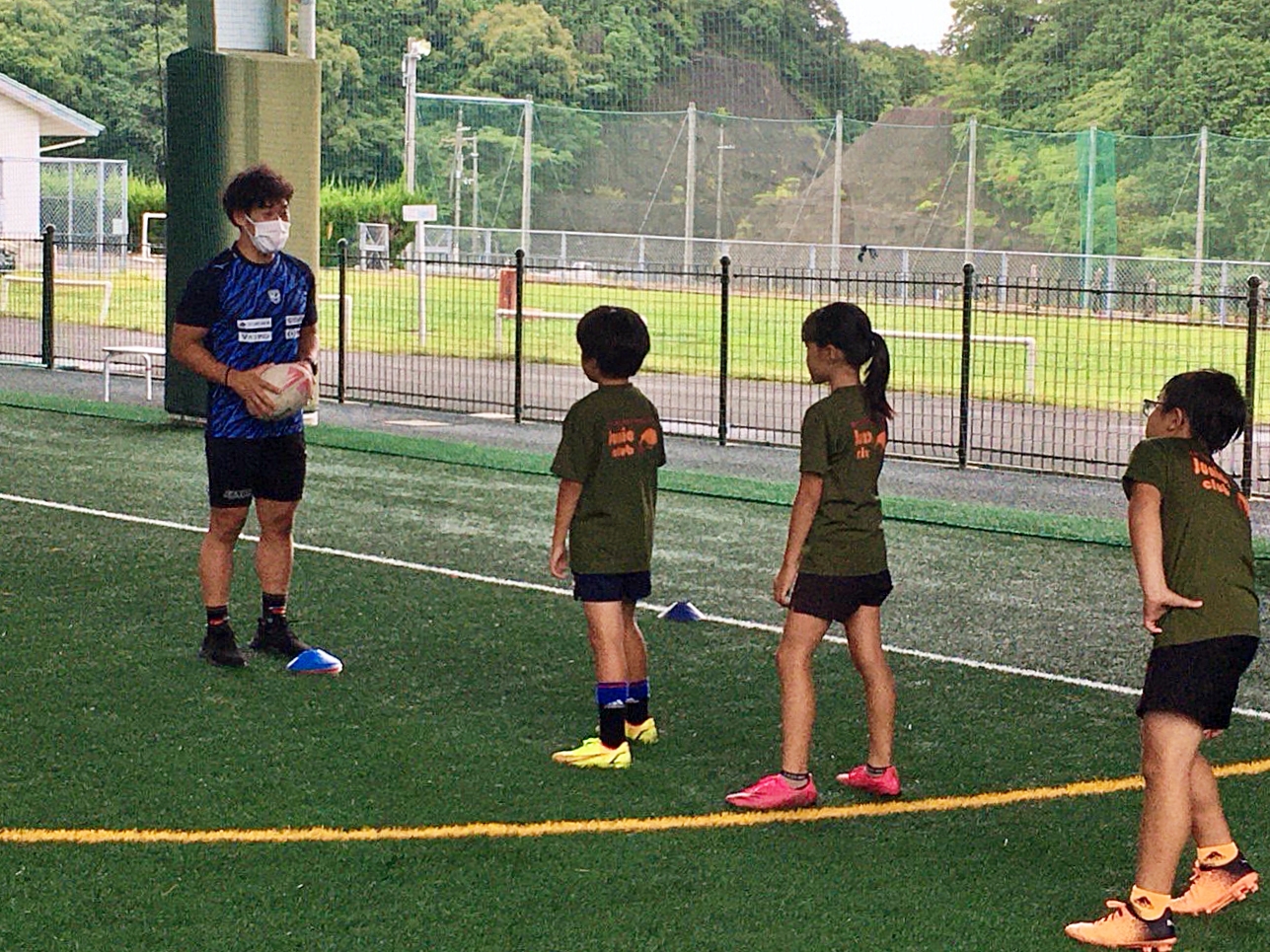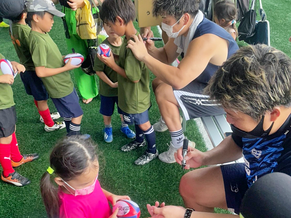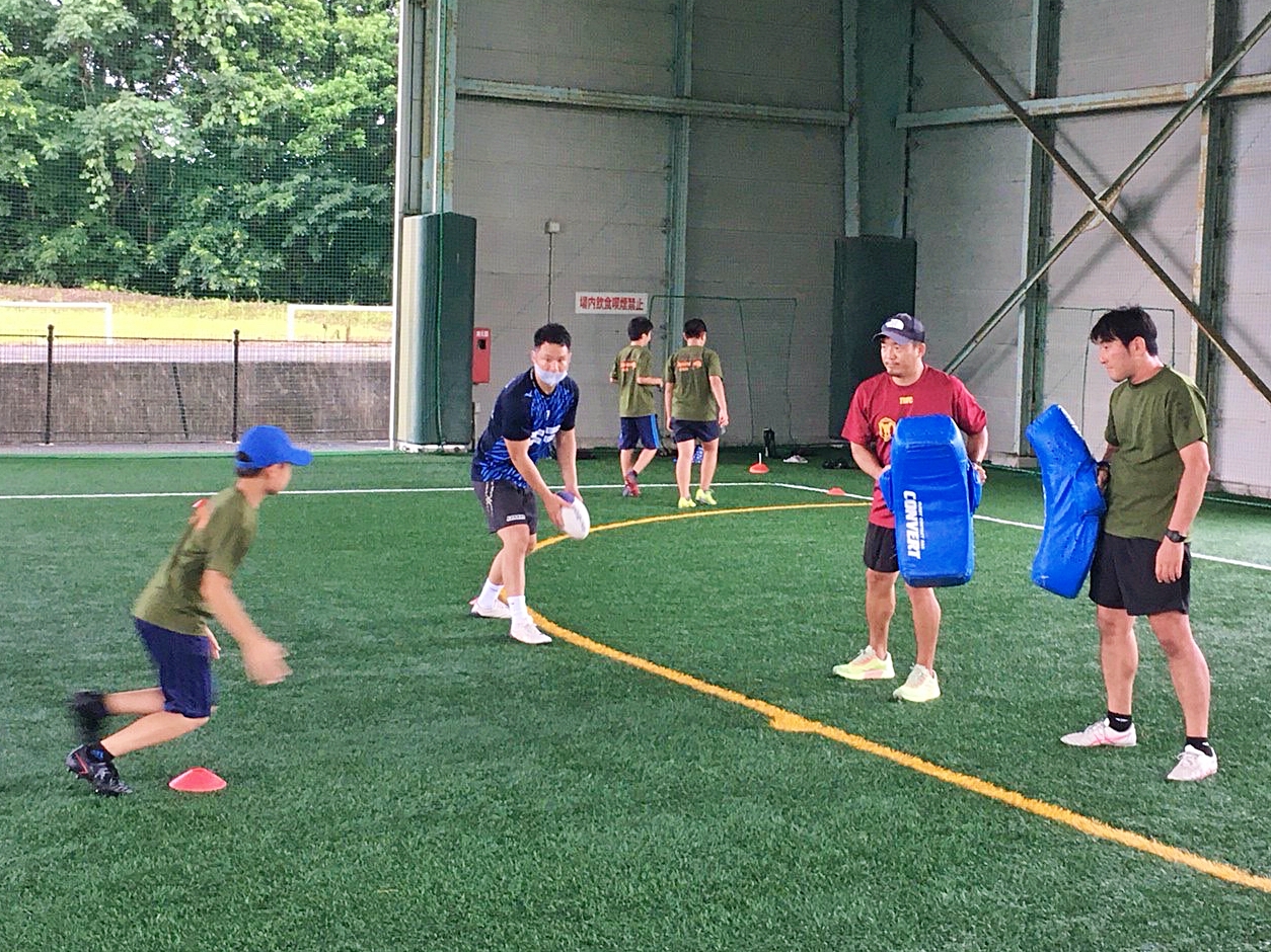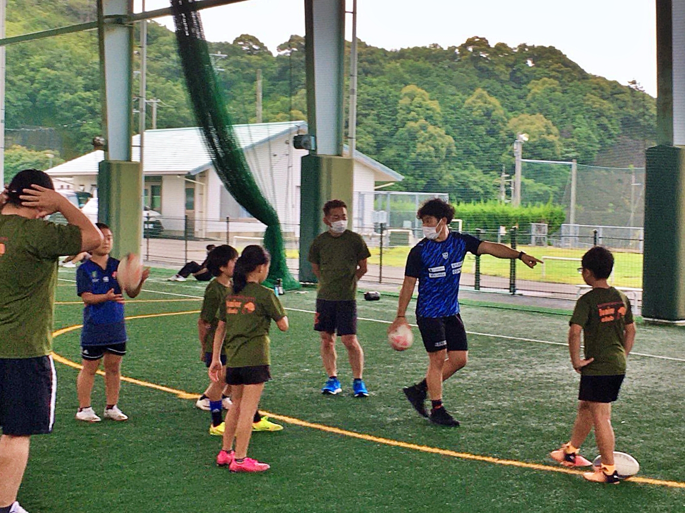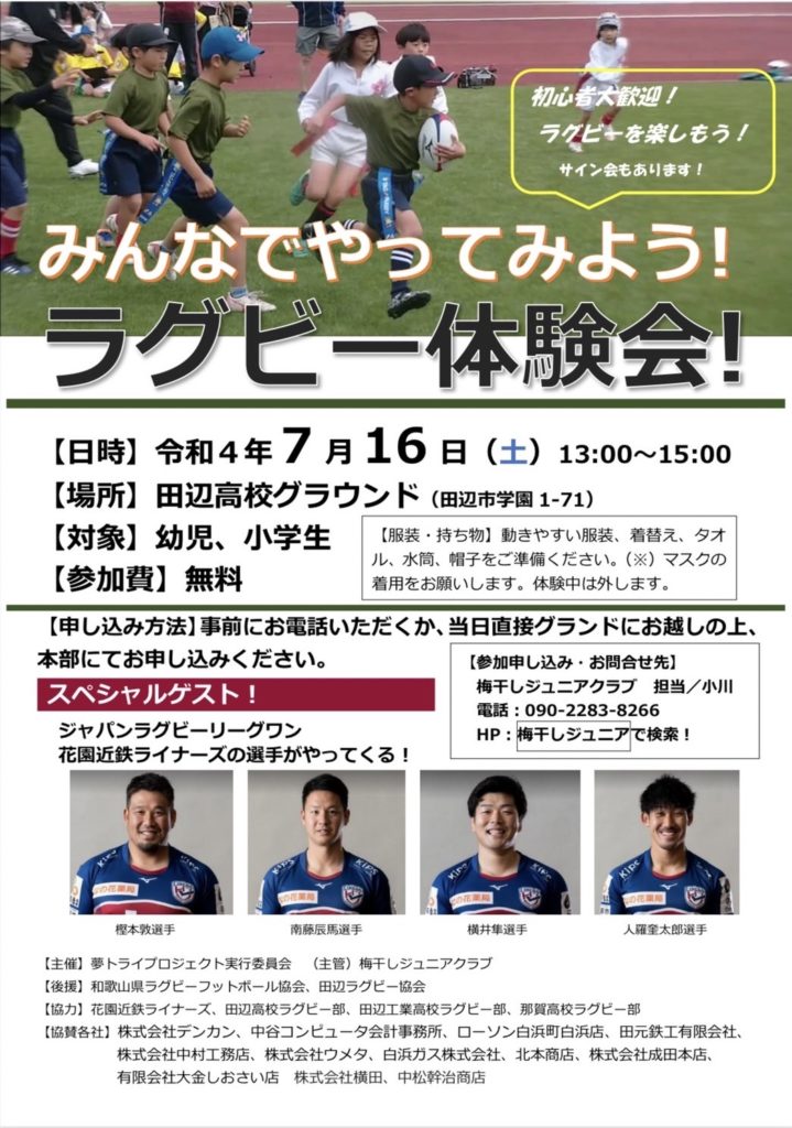 7月16日(土)、上富田スポーツセンターにて行われたラグビー体験会にゲストでお招きいただき、樫本敦・南藤辰馬・横井隼・人羅奎太郎の4選手と村下雅章副務が参加しました。