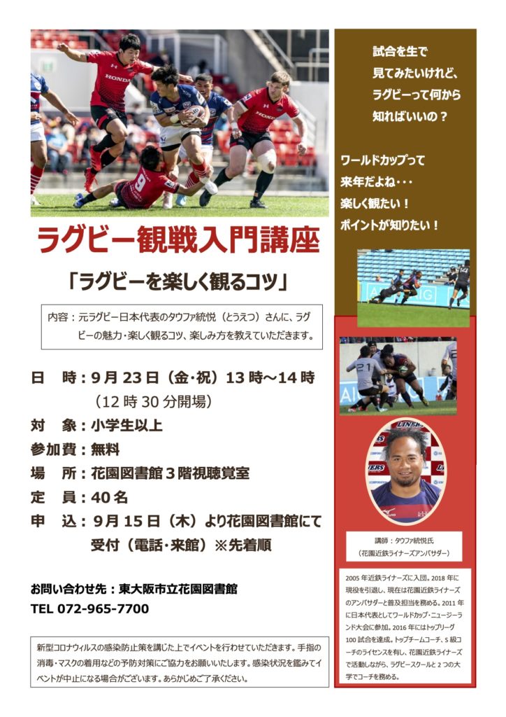 9月23日(金・祝)、東大阪市立花園図書館にて開催の「ラグビー観戦入門講座『ラグビーを楽しく観るコツ』」に、花園近鉄ライナーズからタウファ統悦普及担当が講師として参加します。