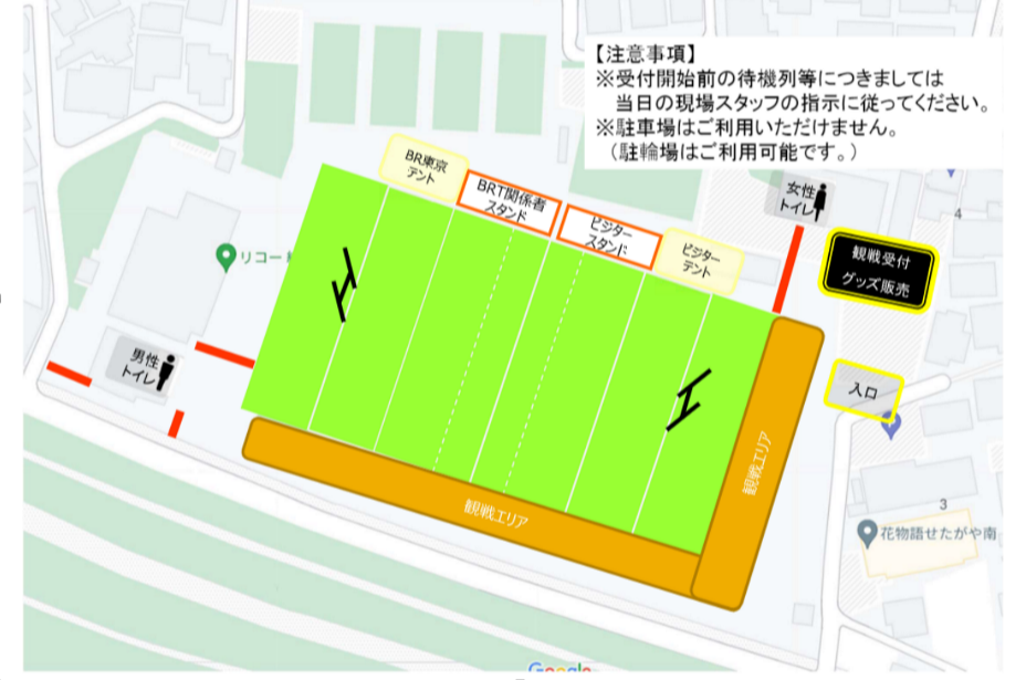下記地図の「観戦受付(黒)」で受付をしていただき、観戦エリア(オレンジ)にて観戦ください。観戦は事前申込いただいた方に限ります。※申込みは終了しています。