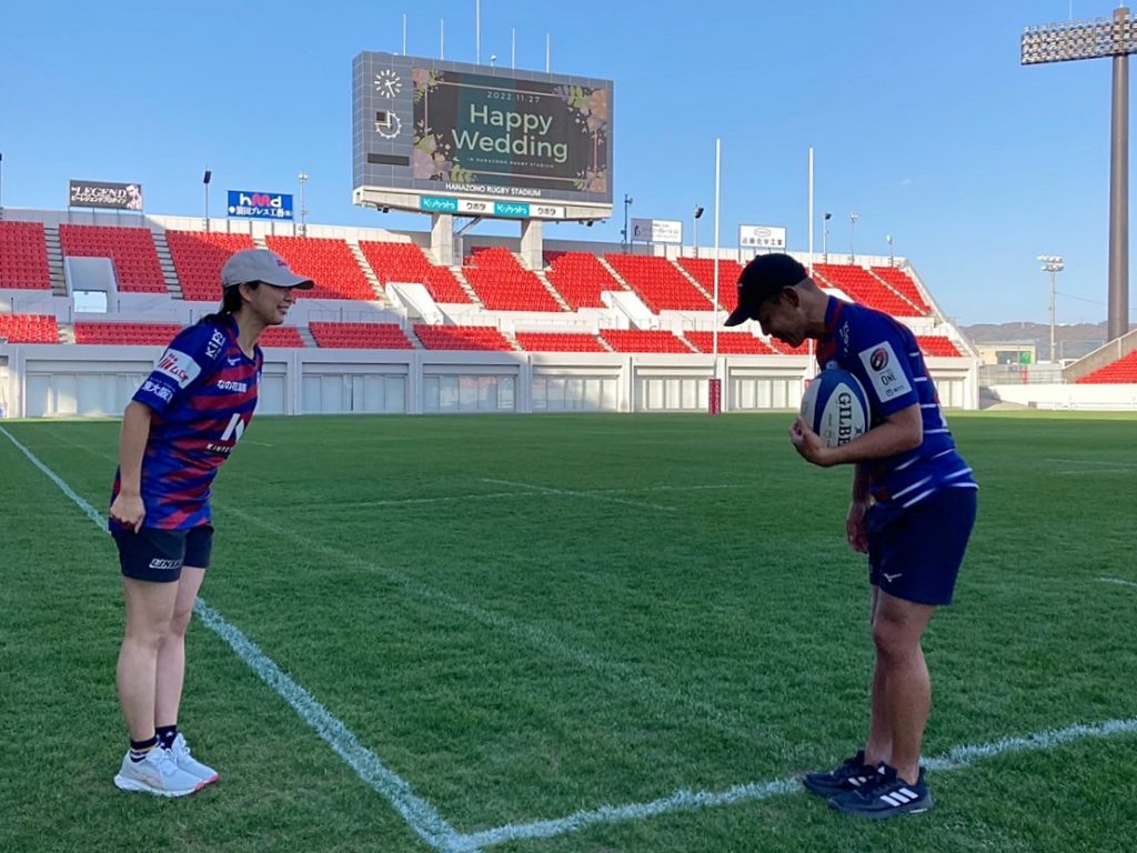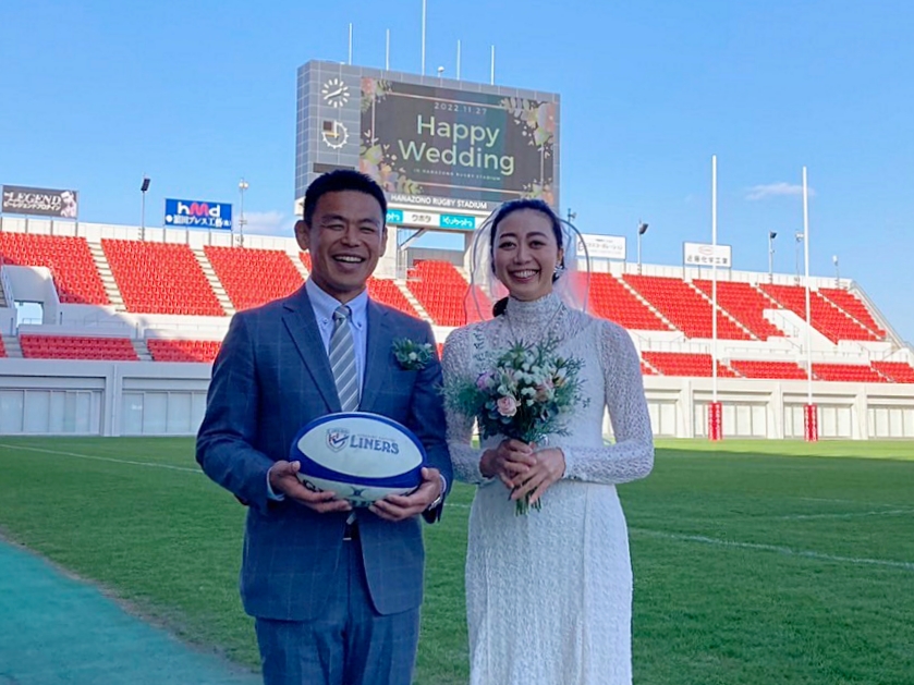 11月27日(日)、東大阪市花園ラグビー場で開催されたフォトウェディング企画「新婚応援 セルフロケフォト in 花園ラグビー場」に、この日入籍した水間良武ヘッドコーチが参加しました。