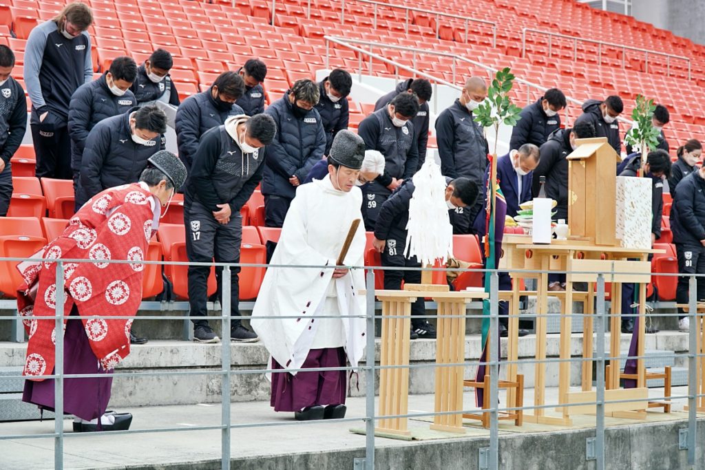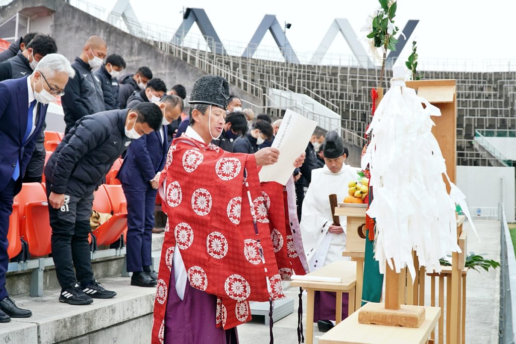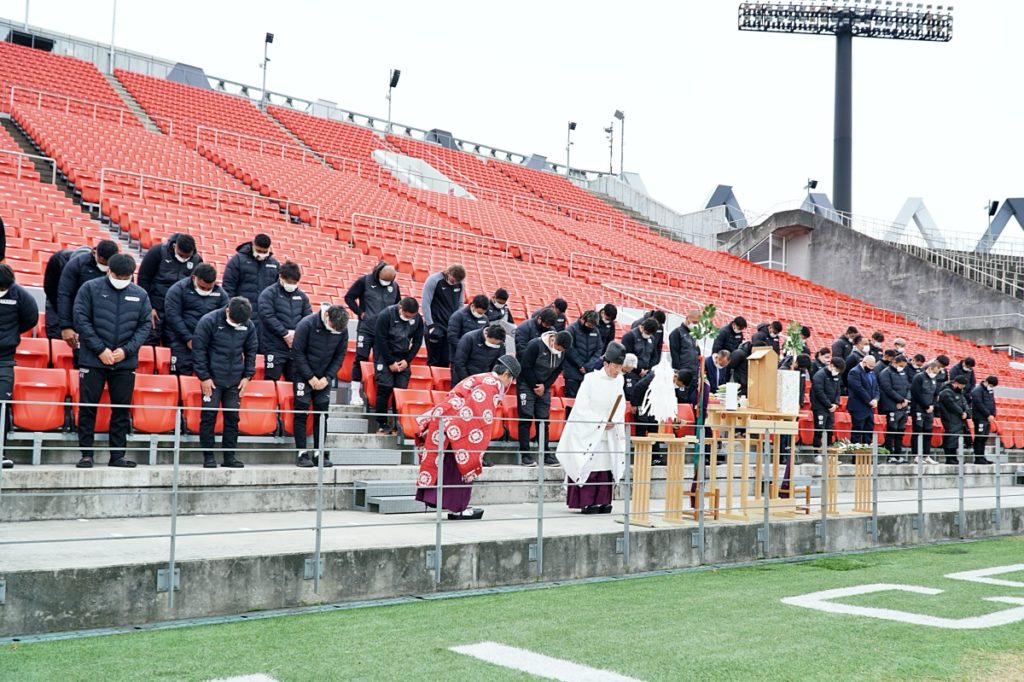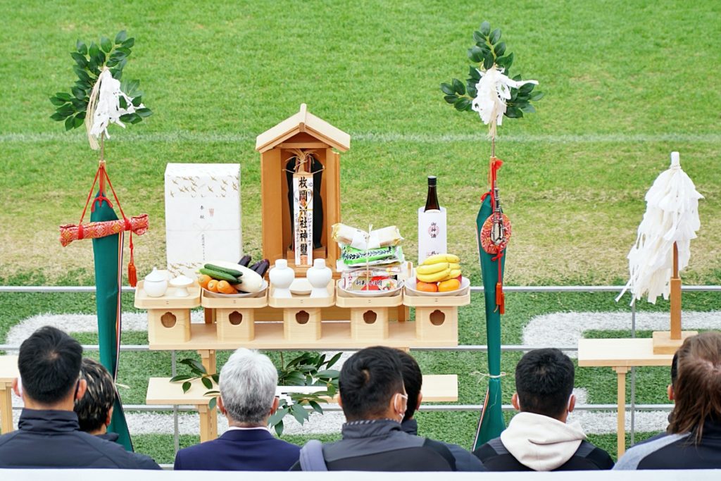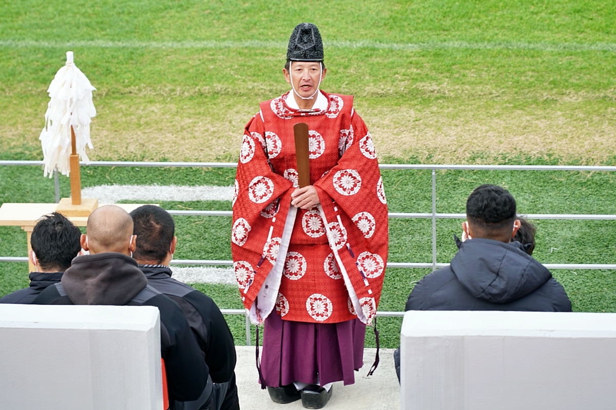 密を避けるため広さが取れる花園ラグビー場に、枚岡神社から神職にお越しいただき、ライナーズが試合をする第1グラウンドにて実施。