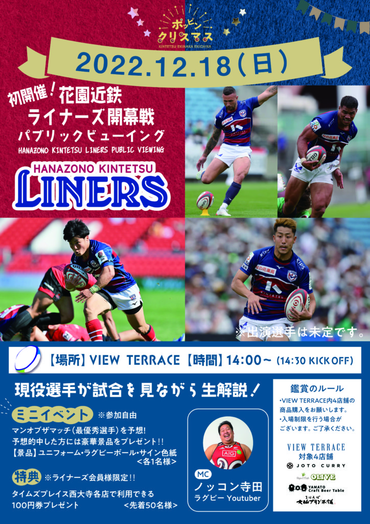 12月18日(日)に開催されるJAPAN RUGBY LEAGUE ONE 2022-23・第1節 グリーンロケッツ東葛戦が、Time’s Place西大寺(近鉄大和西大寺駅構内)にてパブリックビューイングされます。