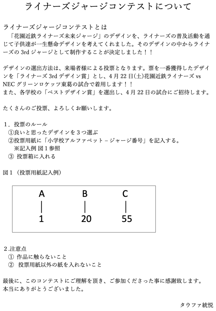 先日お伝えしました、1月8日(日)・14日(土)に実施する「花園近鉄ライナーズ未来ジャージコンテスト」の投票方法をお知らせいたします。
