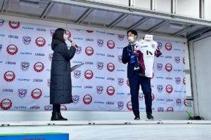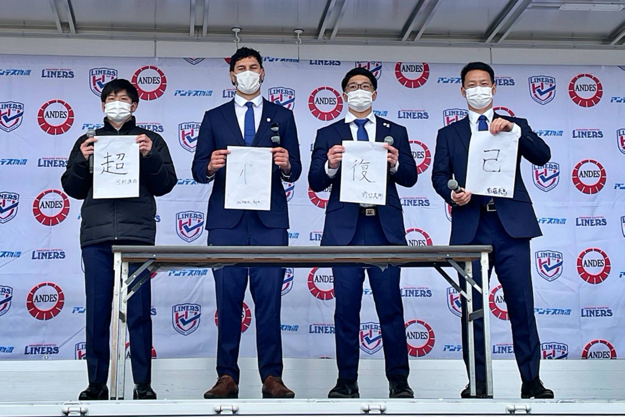 その後は選手による書き初め大会や新作グッズの紹介、ライナーズ福袋が当たるじゃんけん大会を実施しました。