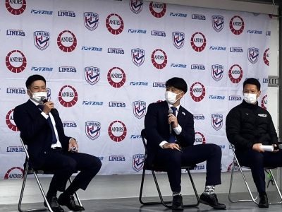 ライナーズの2023年度新加入選手のお披露目からスタートし、PR岩上龍・FL梅村柊羽・CTB/WTB金澤春樹の3選手がシーズンへの意気込みなどを話しました。