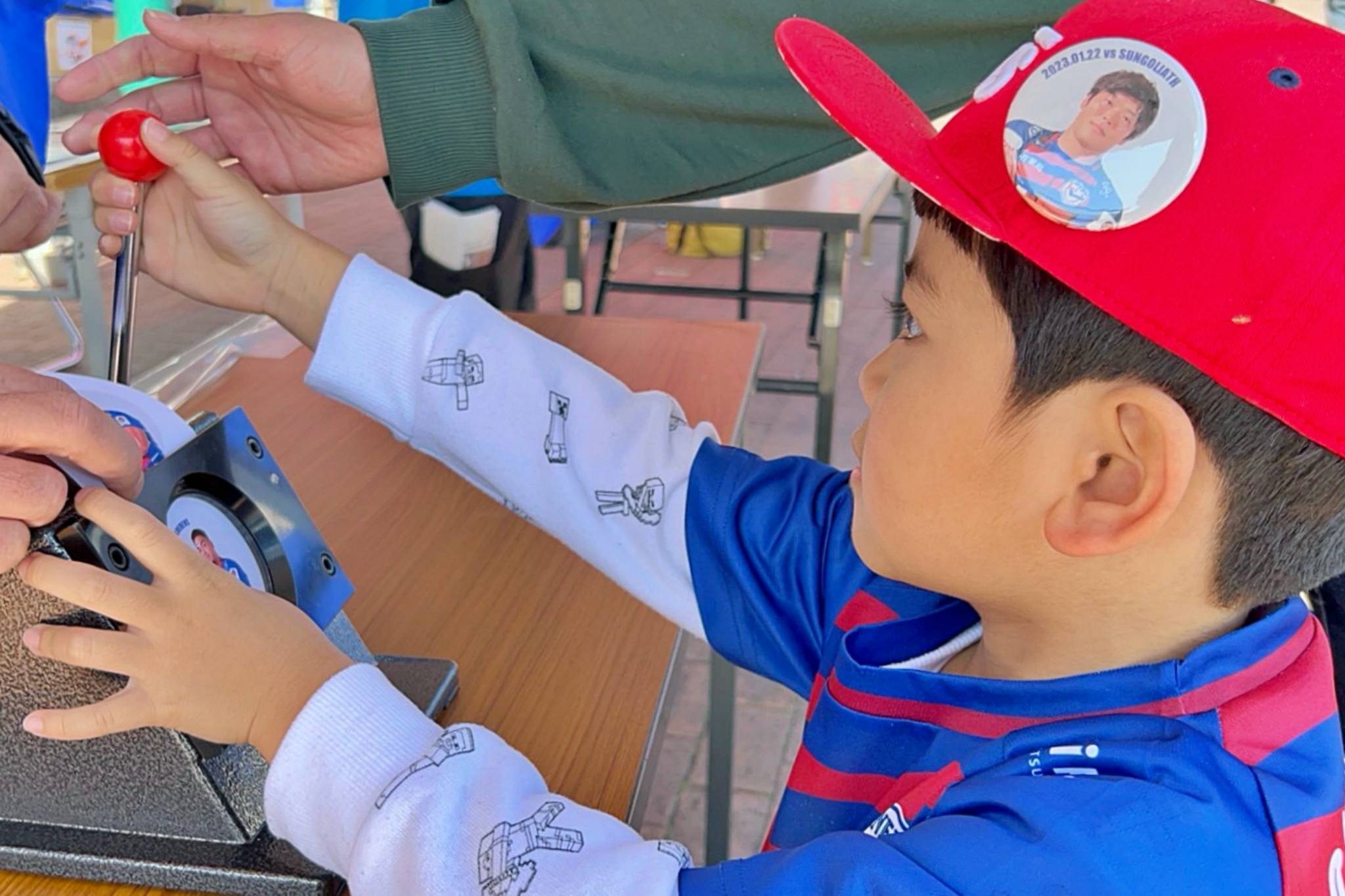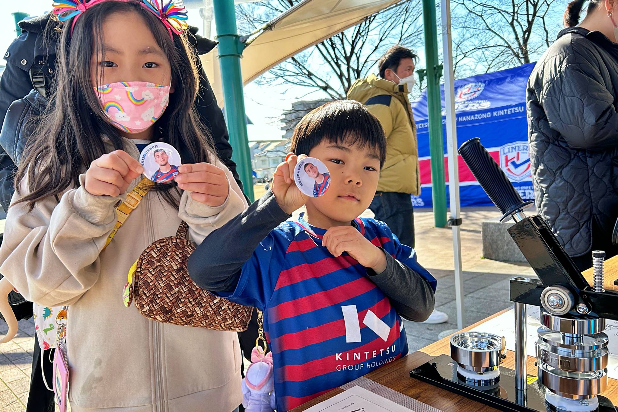 毎回好評の缶バッチ作りは、ラグビーパークに参加した梅村柊羽、ヴィンセント・セフォ、金澤春樹の3選手も自ら作成。