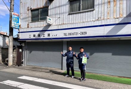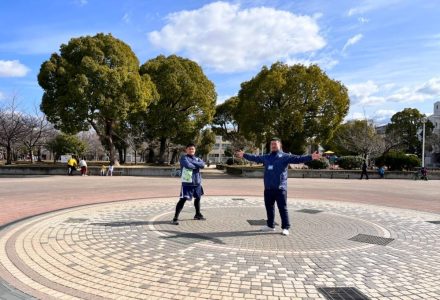 2人はスタート地点の東大阪市花園ラグビー場から、恩智川・ジョージベーカリー・セカイホテル・布施戎神社・モモヤ・三ノ瀬公園・二輪車工房イシダ・樟徳館・お好み焼 てらまえなど回り、ゴールのラグビー場まで戻ってきました。