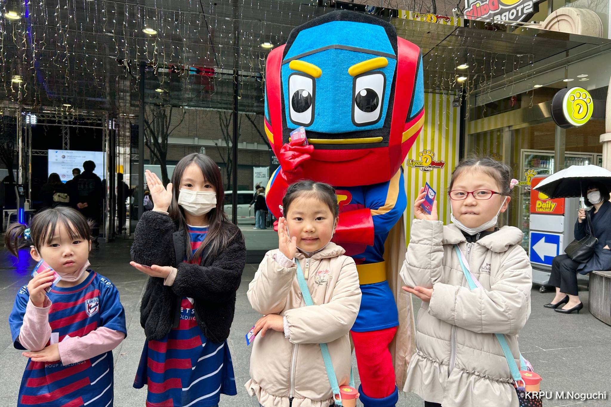 午前中はライナーズのマスコットキャラクター・ライナマンがオープニングやラグビーダーツブースに登場し、訪れた人々と写真撮影やグリーティング。多くの方にお声がけいただきました。
