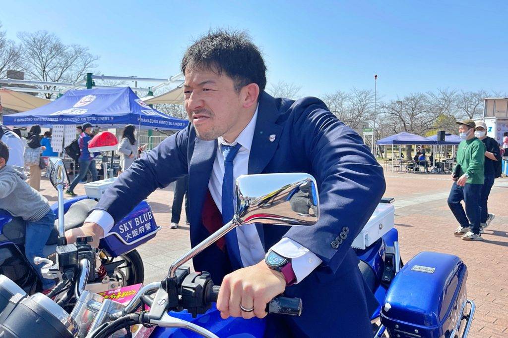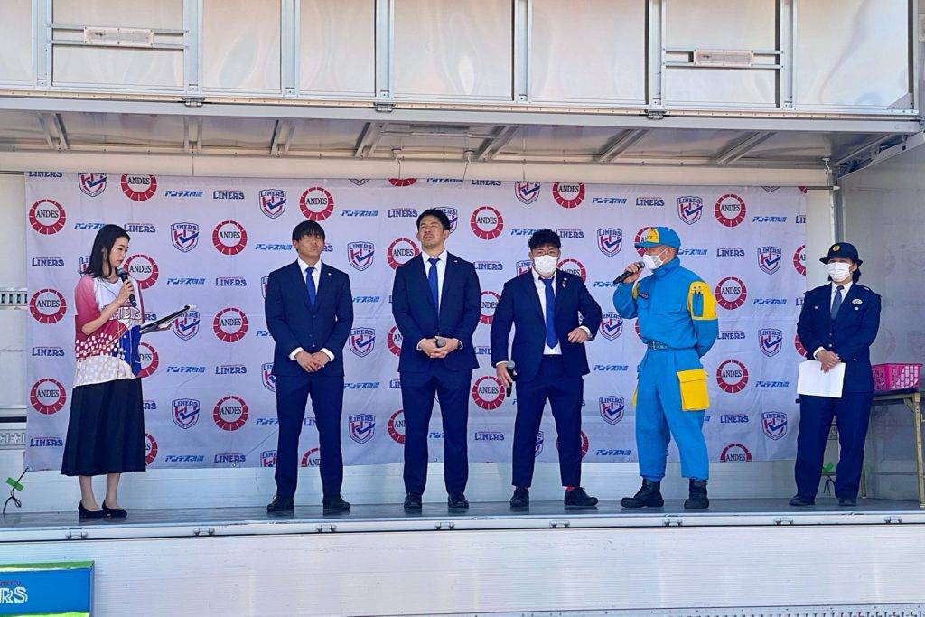 近畿大学附属高等学校 吹奏楽部の演奏からスタート。その後は近鉄吹奏楽部ミュージックメッセンジャーズ、河内警察署PRと続きます。河内警察署PRでは、淺岡勇輝・村田毅・林隆広の3選手もステージに登壇し、防災についてトークしました。