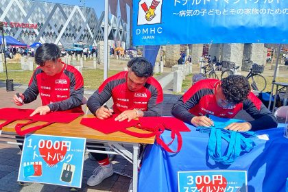 ライナーズがパートナーシップ協定を結ぶ公益財団法人ドナルド・マクドナルド・ハウス・チャリティーズ・ジャパンのブースでは、募金活動や牛乳パック募金箱作成やキックターゲットを実施いただきました。キックターゲットは選手もサポートに。