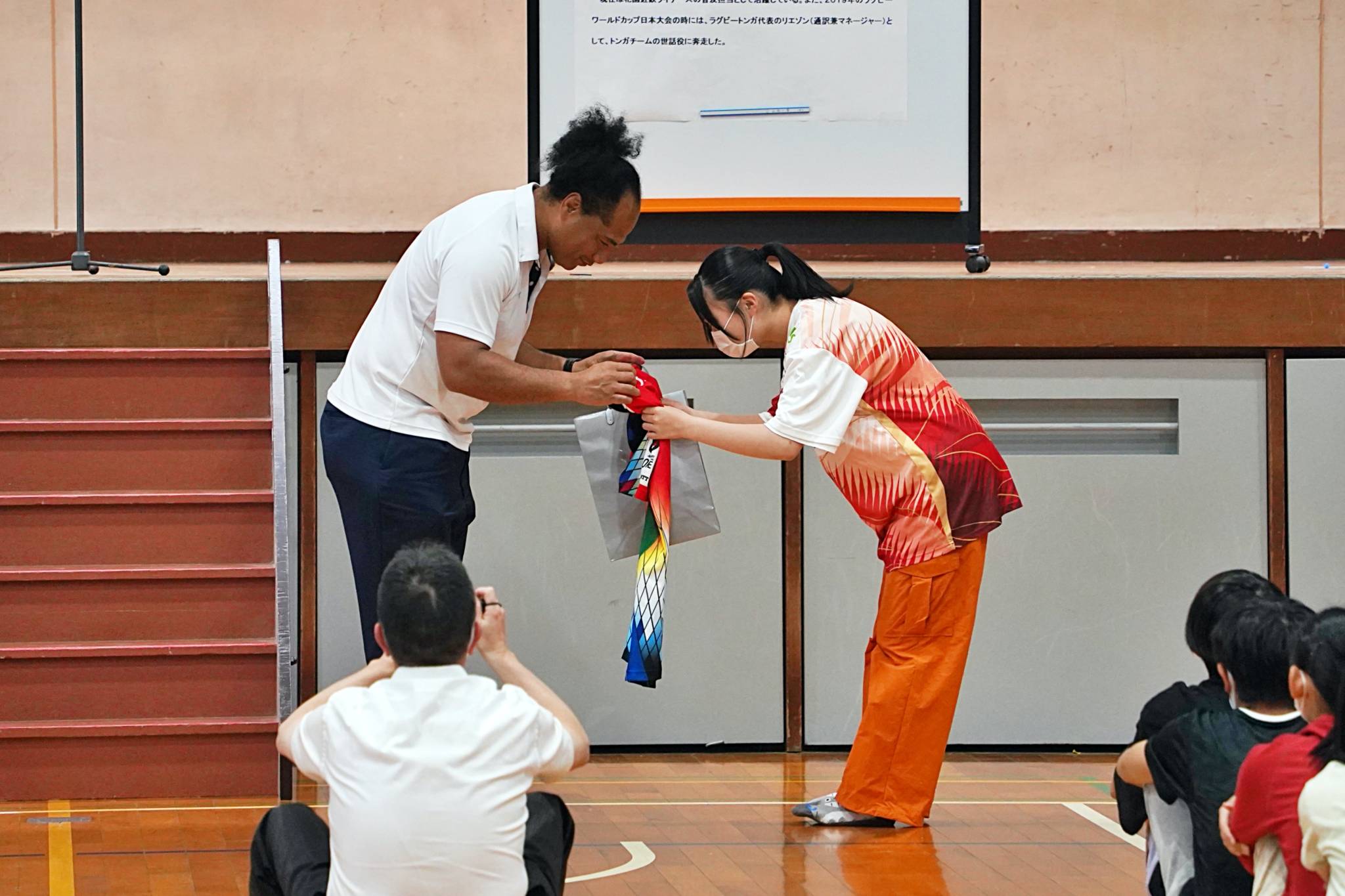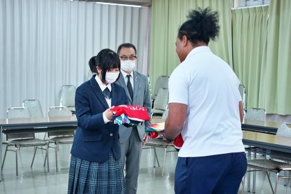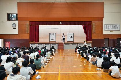 はじめに、前田さんがデザイン当時に通っていた奈良市立平城中学校へ。全校生徒の前でタウファ統悦普及担当がスピーチし、生徒会長の小沼柚佳里さんに贈呈しました。