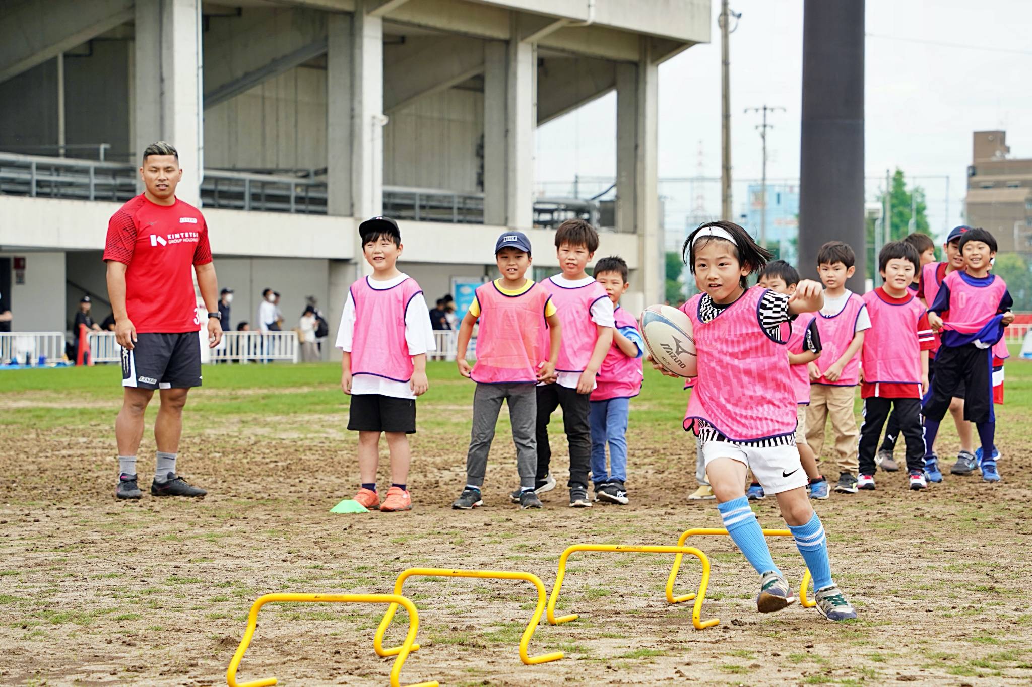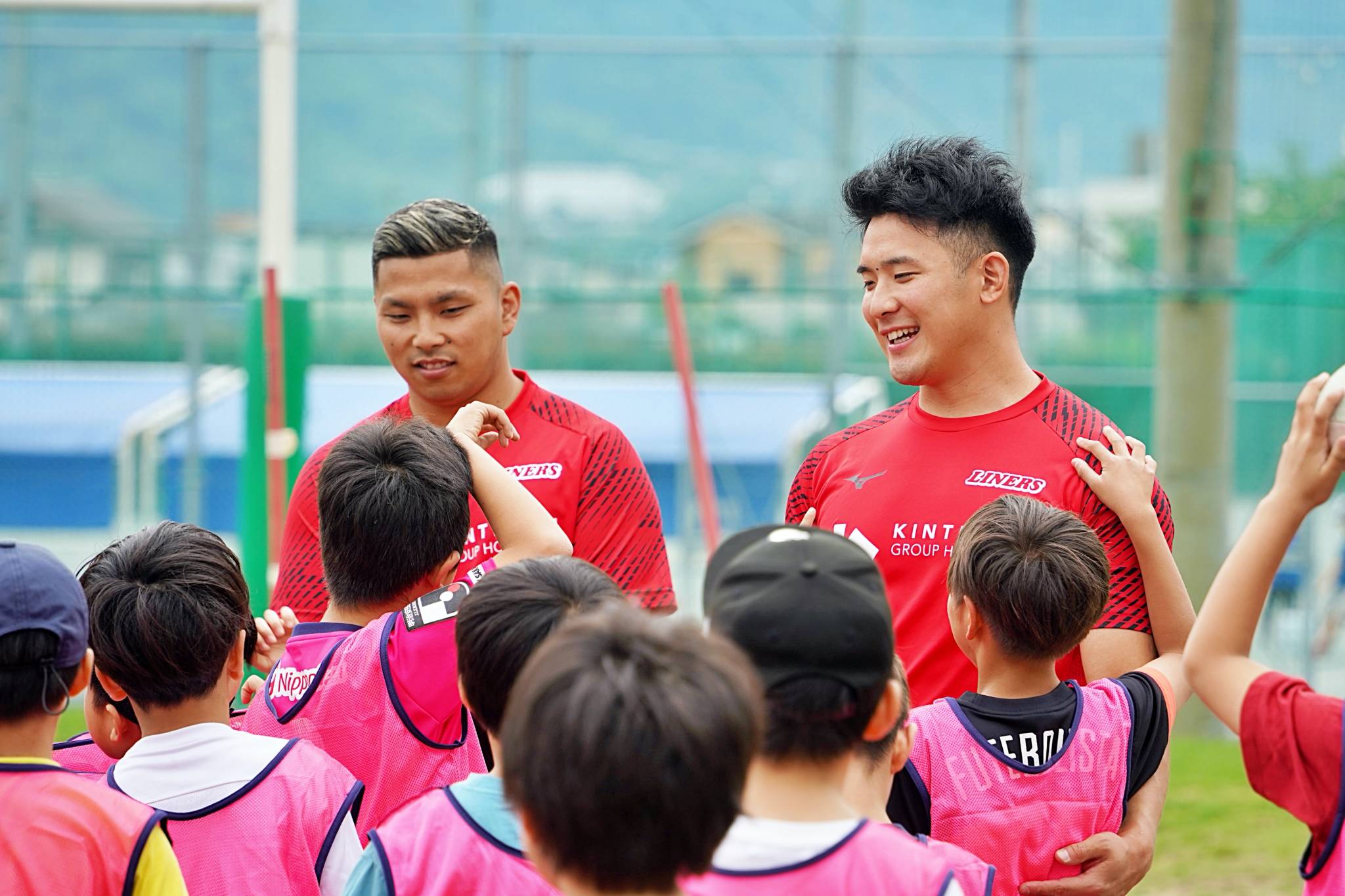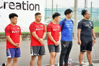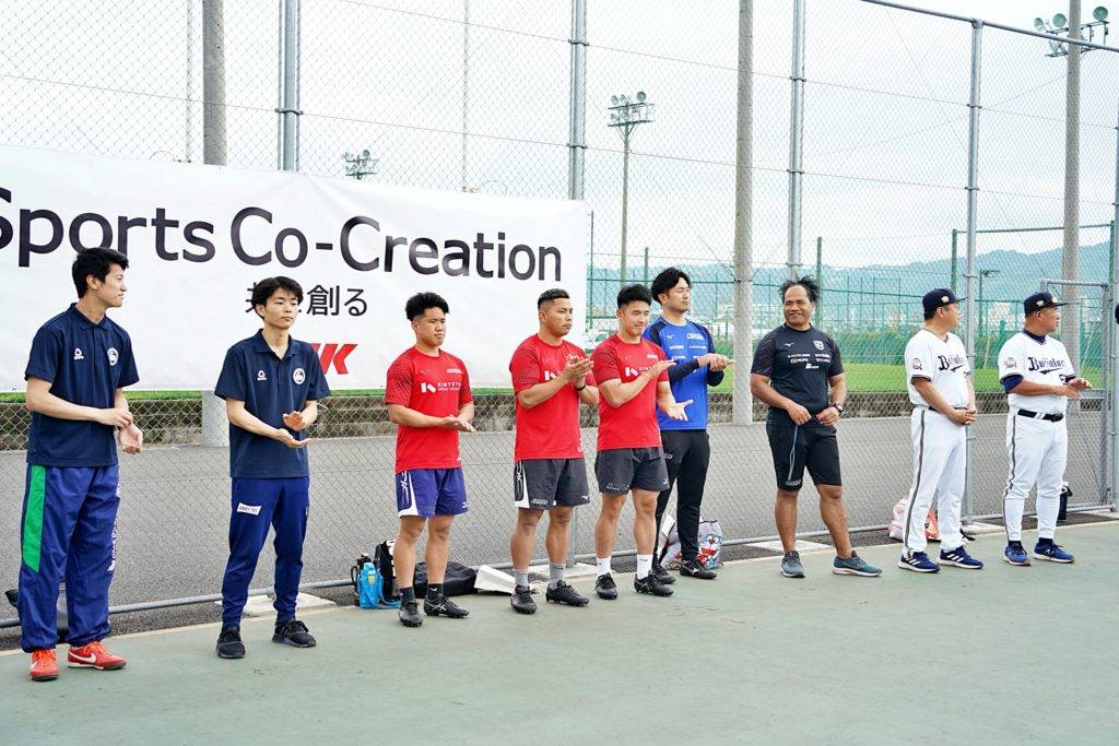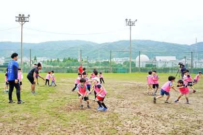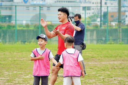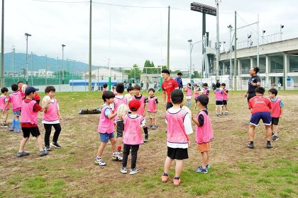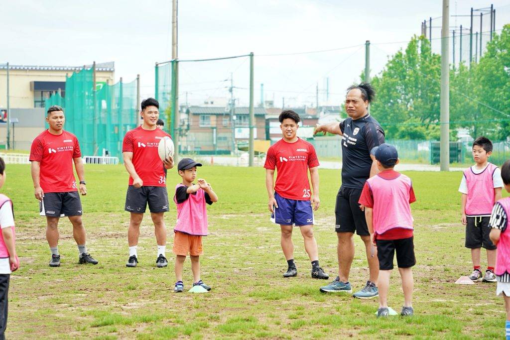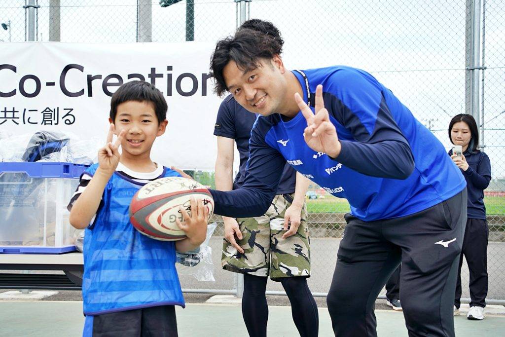 ライナーズからは中村友哉選手、片岡涼亮選手、小野木晃英選手、タウファ統悦普及担当、村下雅章イベント企画担当が参加。パスの練習やラグビーボールを使ったリレーなどで汗を流しました。