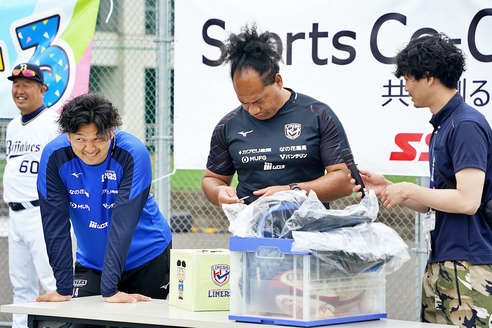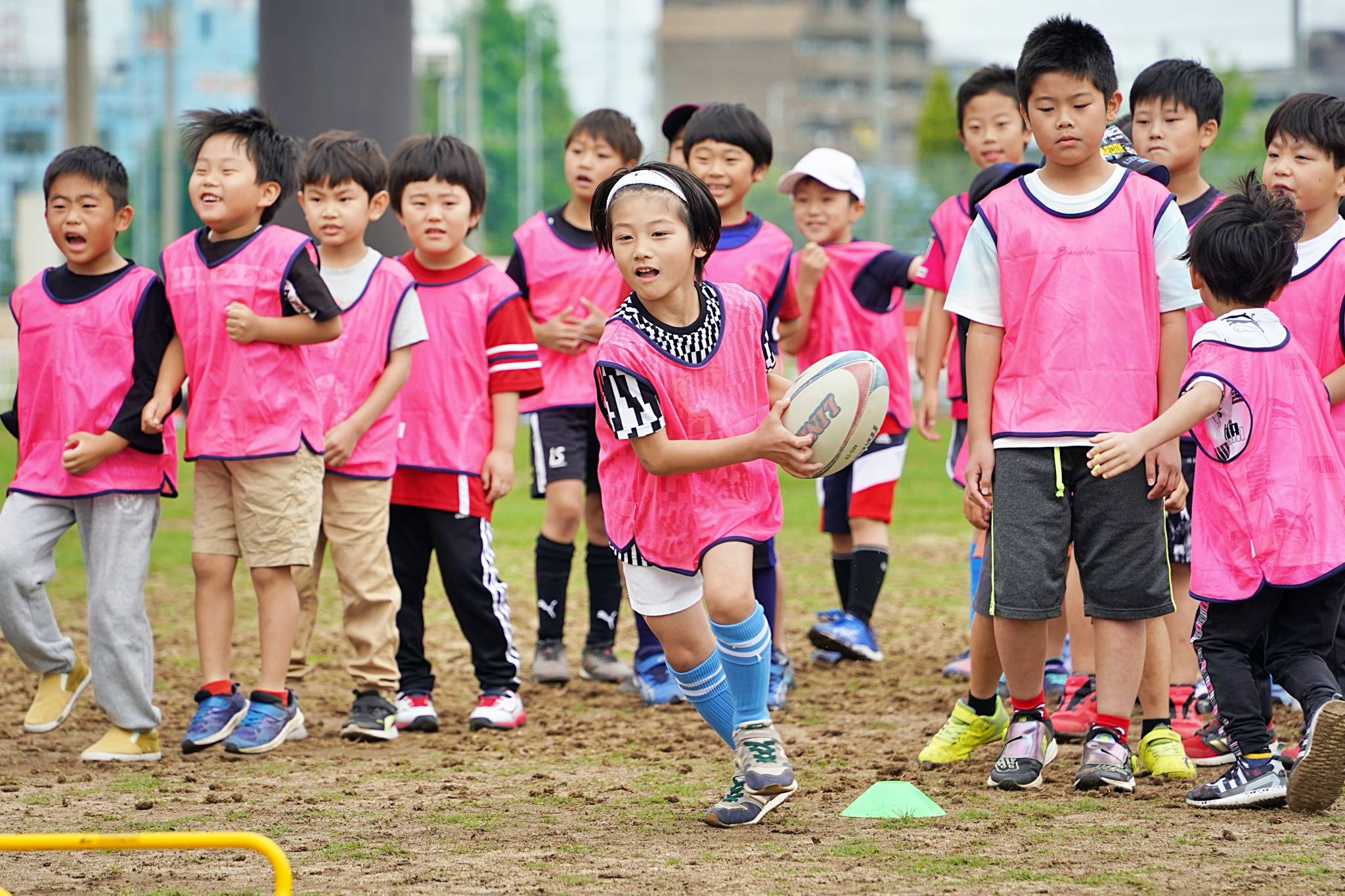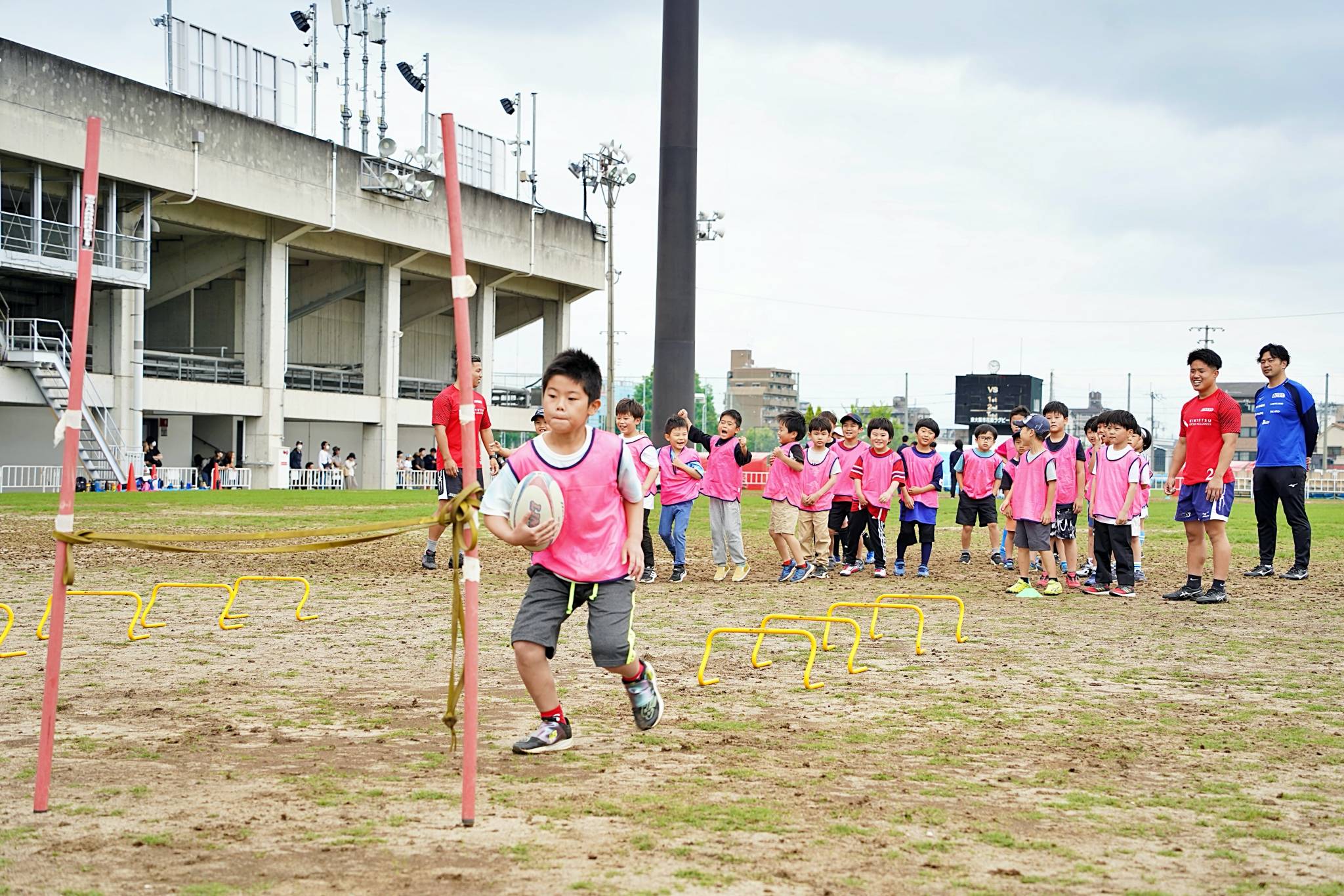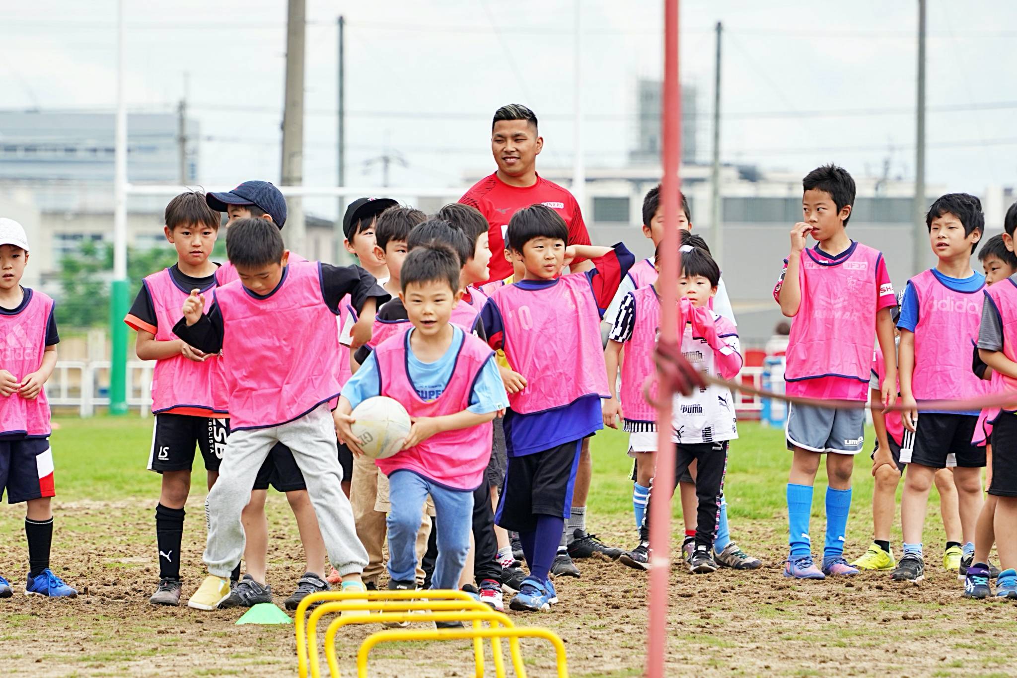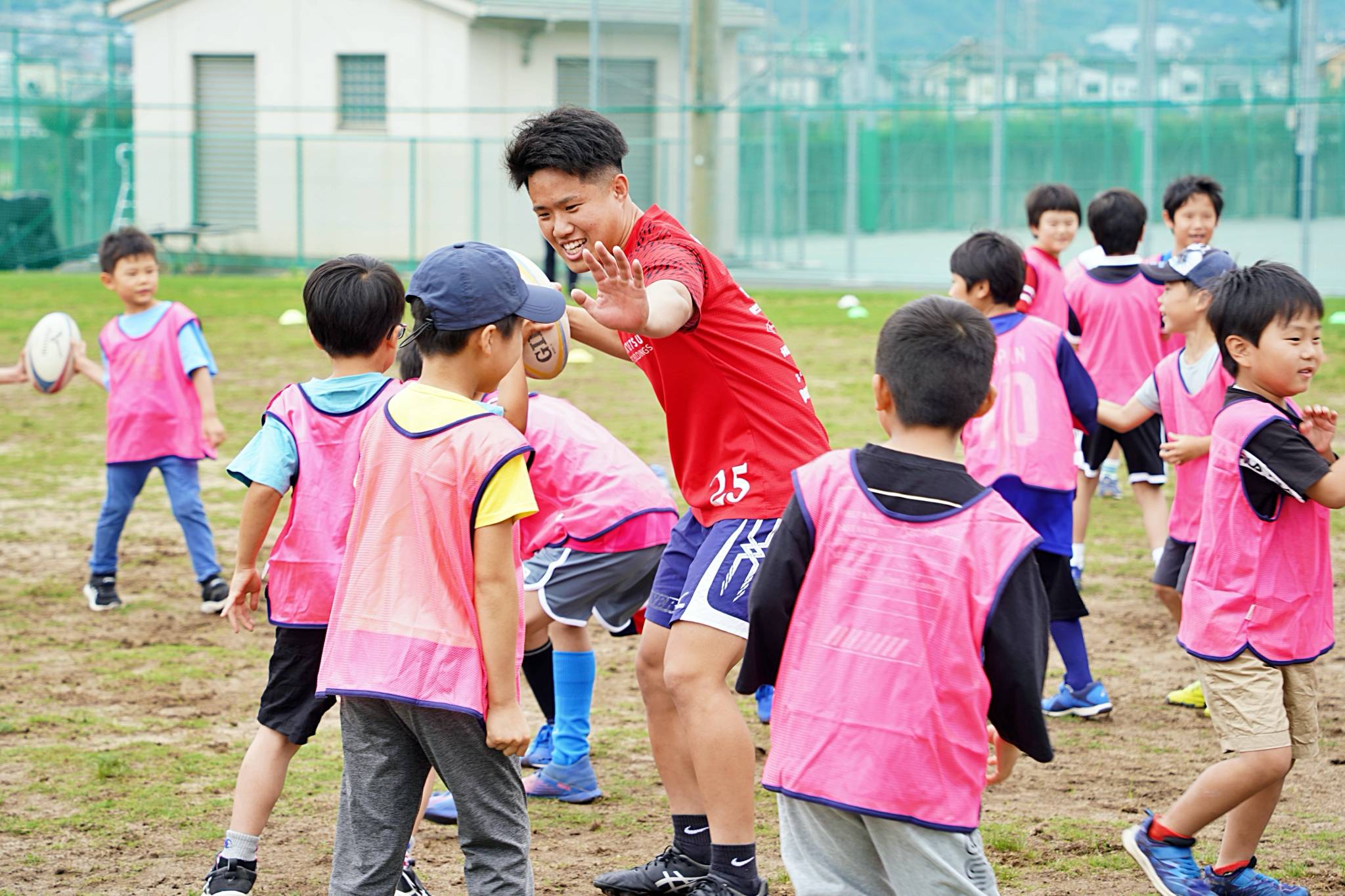 ライナーズからは中村友哉選手、片岡涼亮選手、小野木晃英選手、タウファ統悦普及担当、村下雅章イベント企画担当が参加。パスの練習やラグビーボールを使ったリレーなどで汗を流しました。