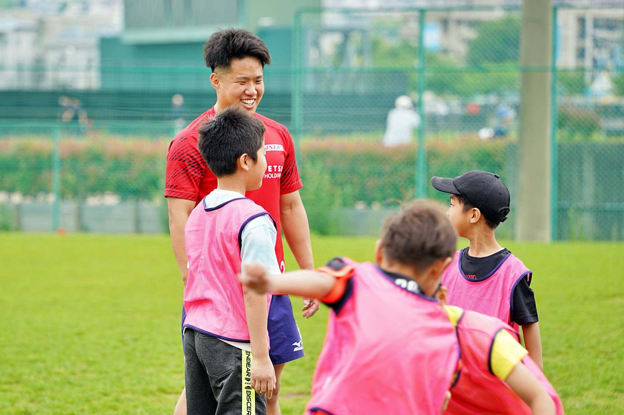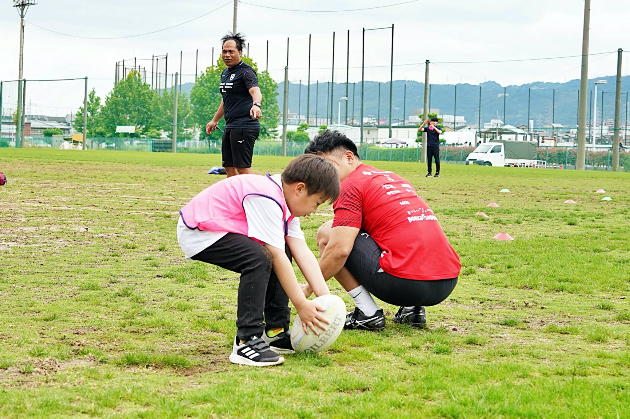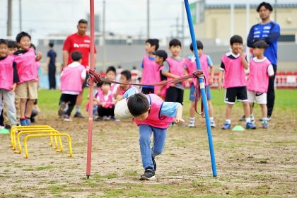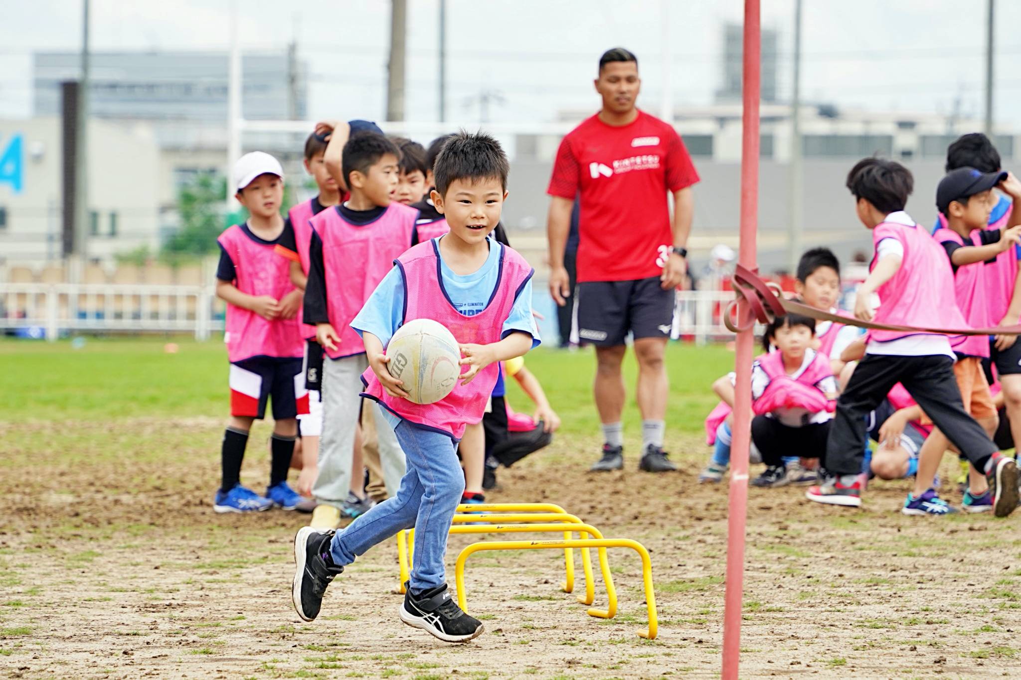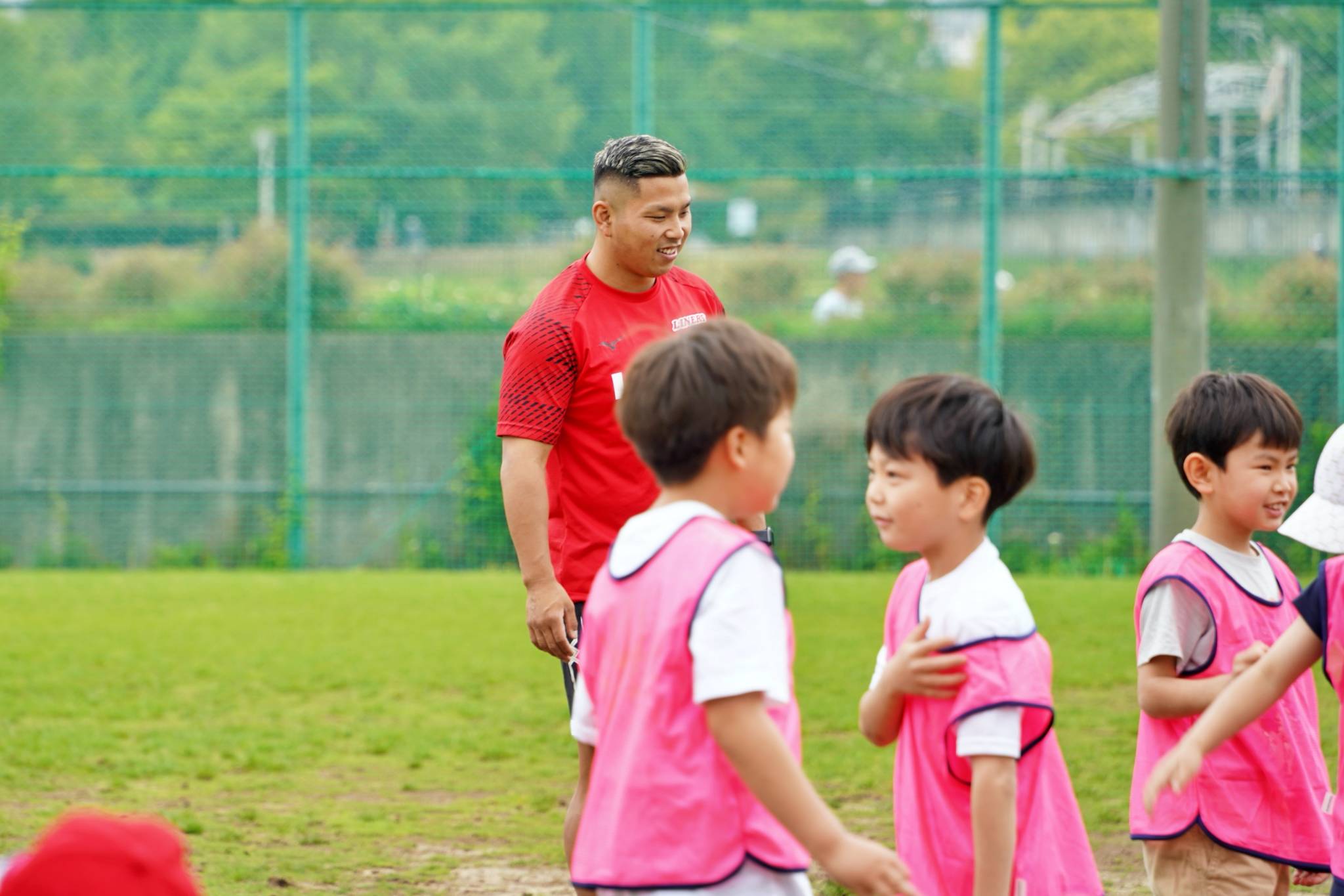 ライナーズからは中村友哉選手、片岡涼亮選手、小野木晃英選手、タウファ統悦普及担当、村下雅章イベント企画担当が参加。パスの練習やラグビーボールを使ったリレーなどで汗を流しました。